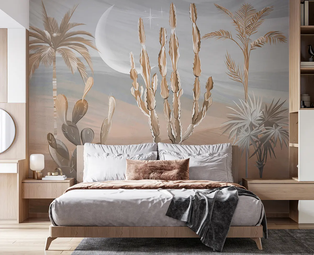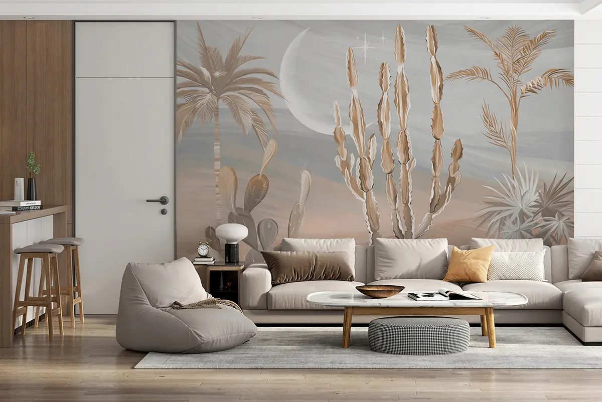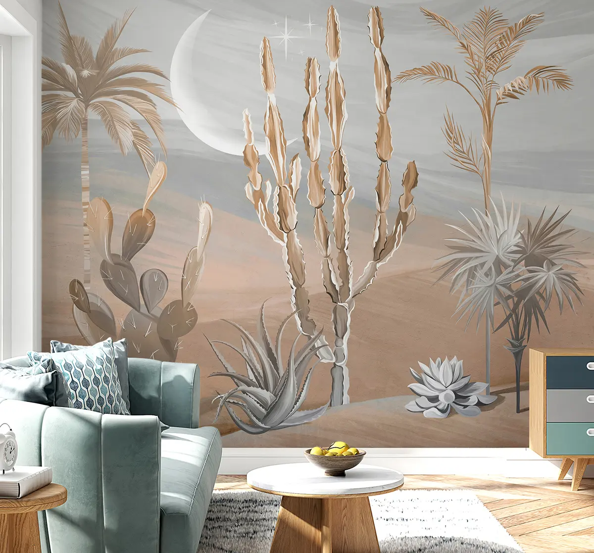 fototapet deșert 3D cu cactuși și frunze tropicale u96444