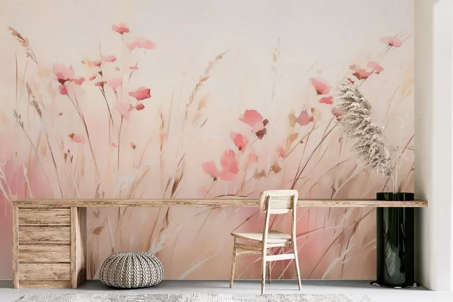 Fototapet Iarbă și buruieni cu frunze și tulpini subțiri, culori roz deschis, tușe moi și delicate, print minimalist