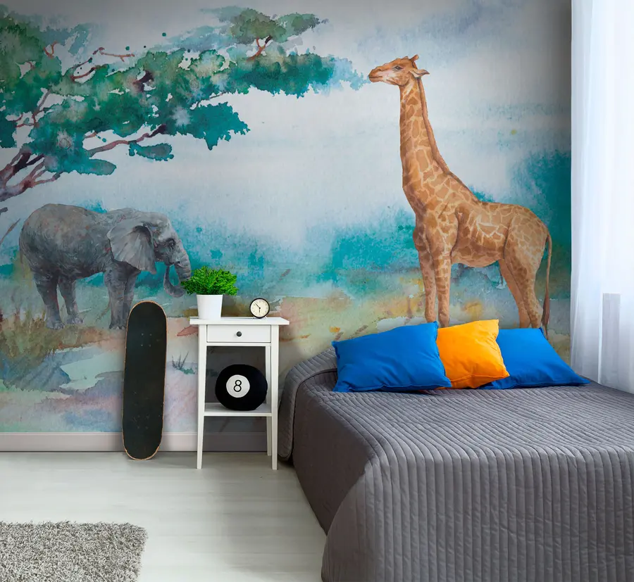 Fototapet Design de junglă pentru copii cu leu, girafă, elefant și papagali