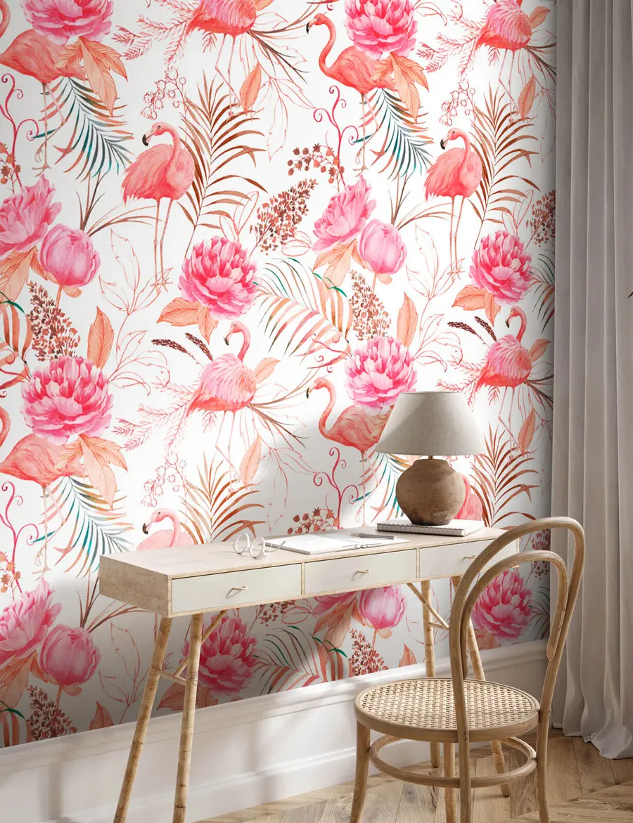 Fototapet Boho stil acuarelă artă, flamingo, frunze tropicale, bumbac, orhidee, bujor, culoare roz