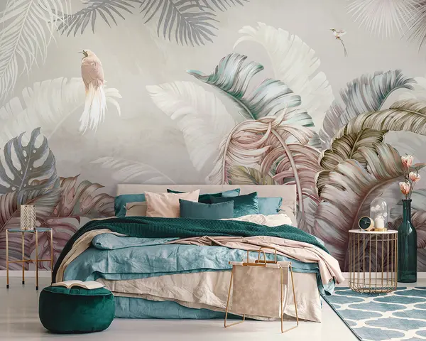 Fototapet Ilustrație tropicală cu frunze de banane palmier și păsări Nr. u96254