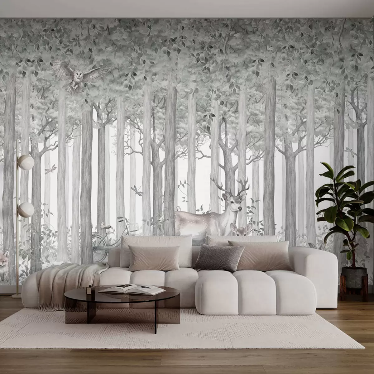 Fototapet Animale de pădure cerb și bufniță în gri Nr. u97629v1
