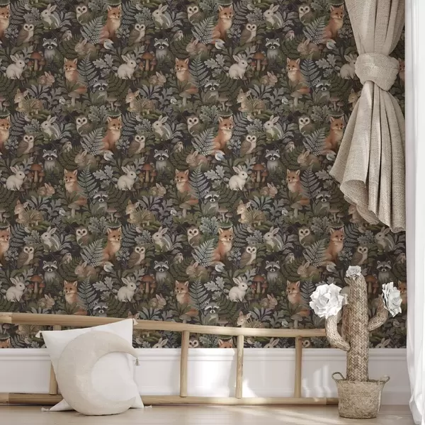 Wallpaper Animale din pădure și ferigi pe cărbune intens a00880