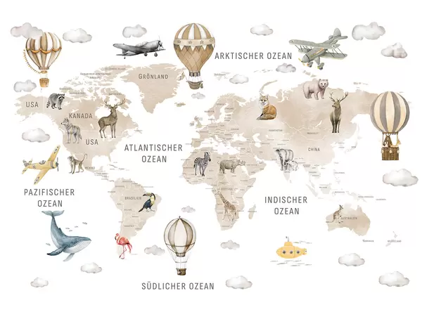 Fototapet Harta pentru copii în stil acuarelă, cu animale și baloane cu aer cald. Limba germană. Culoare bej. Nr. c00001dev2