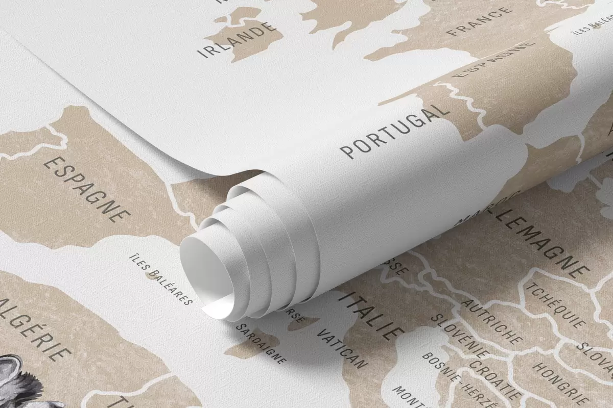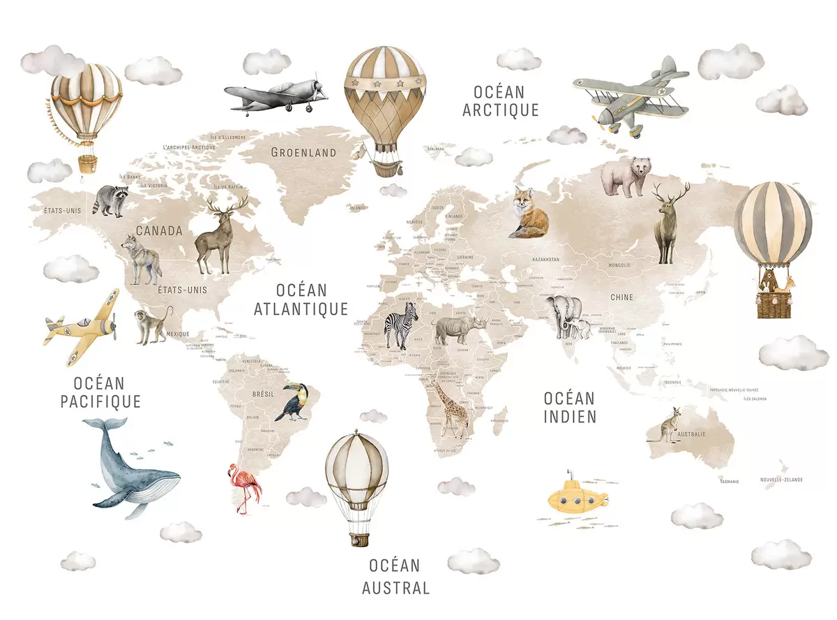 Fototapet Harta pentru copii în stil acuarelă, cu animale și baloane cu aer cald. Limba franceză. Culoare bej. Nr. c00001frv2