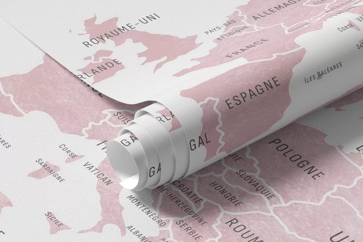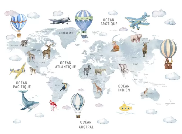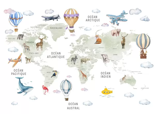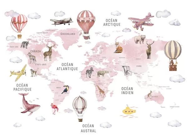 Fototapet Harta pentru copii în stil acuarelă, cu animale și baloane cu aer cald. Limba franceză. Culoare roz. Nr. c00001frv3