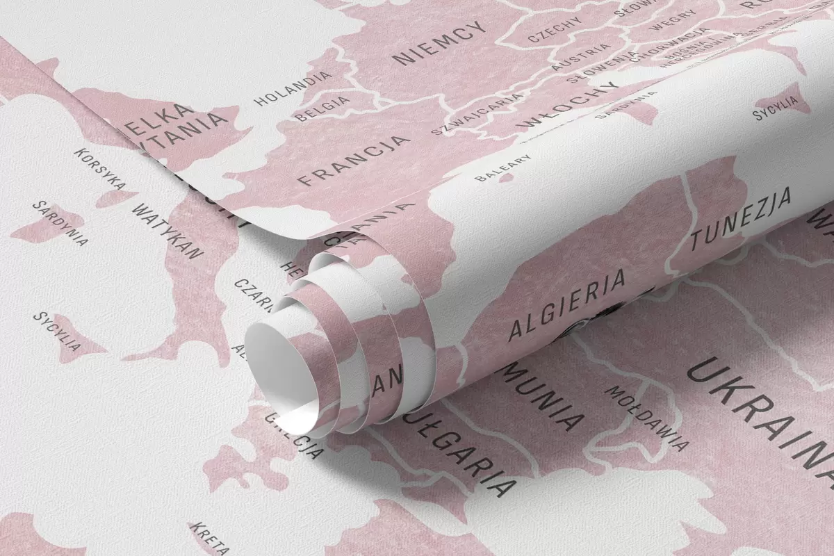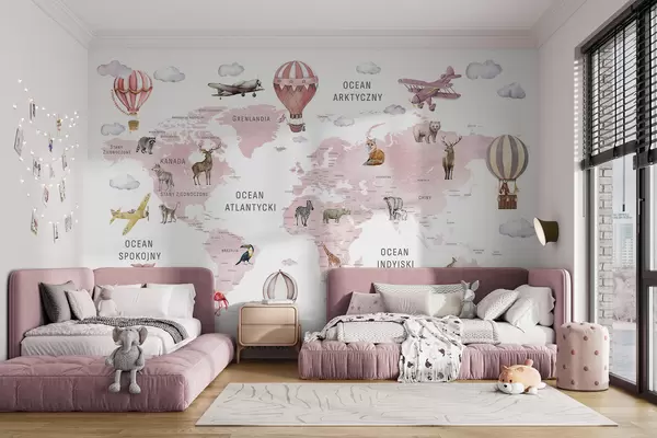 Fototapet Harta pentru copii în stil acuarelă, cu animale și baloane cu aer cald. Limba poloneză. Culoare roz. Nr. c00001plv3