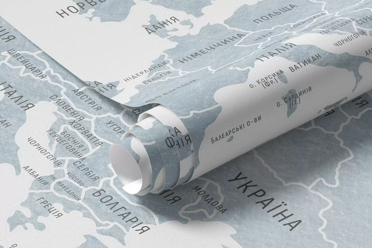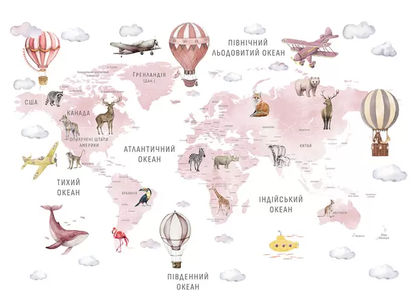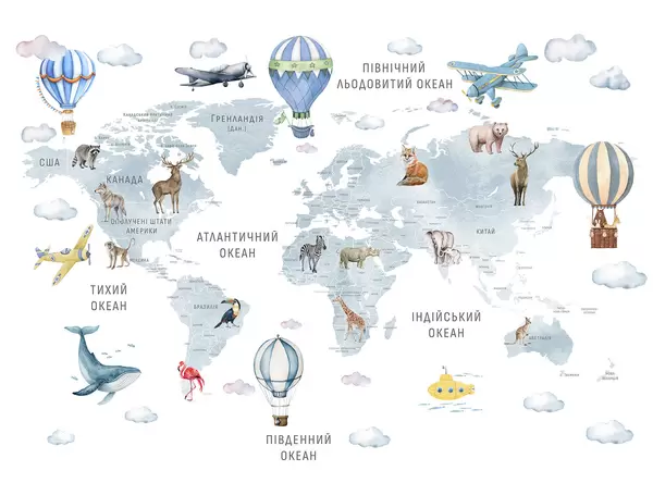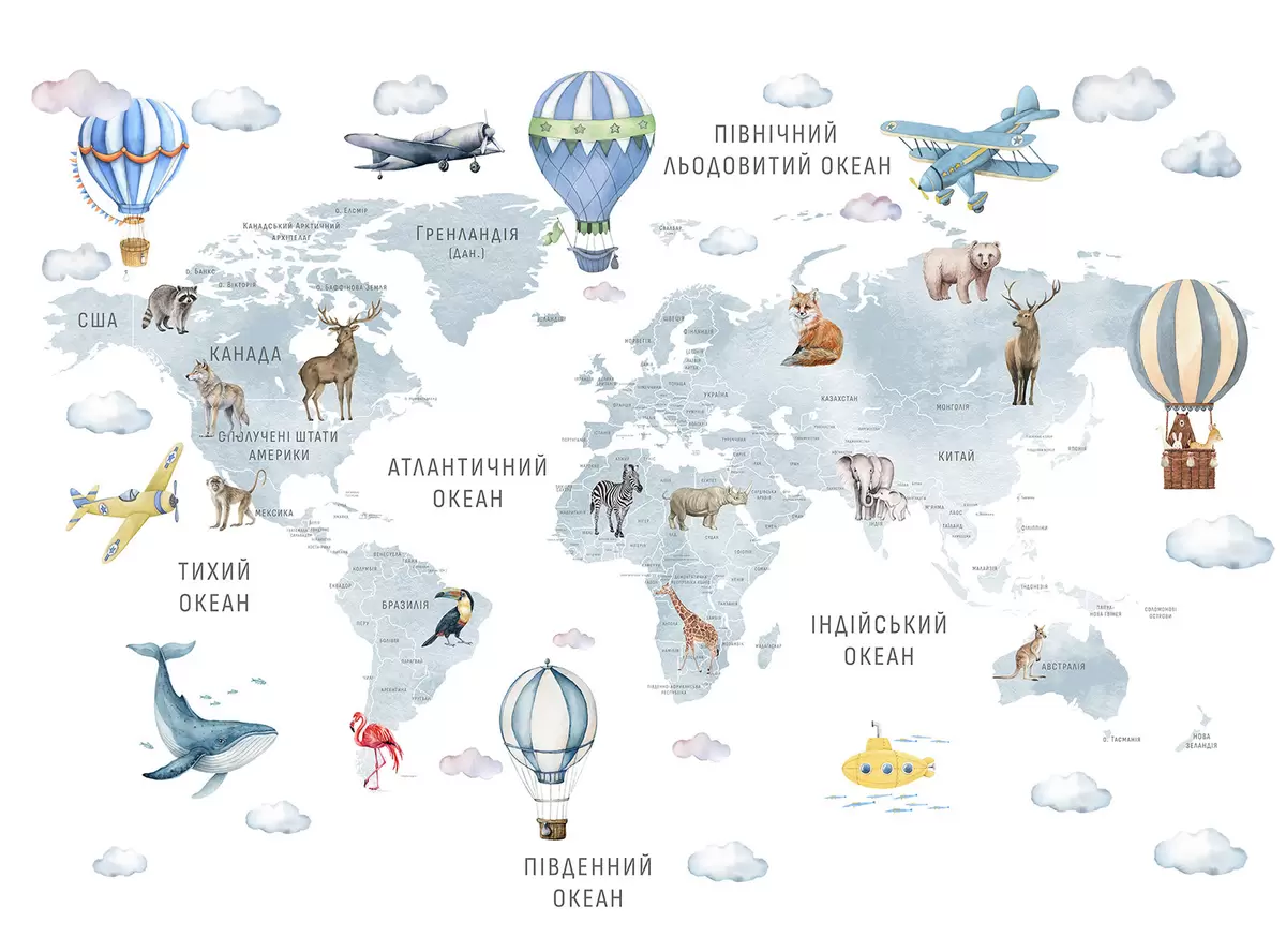 Fototapet Harta pentru copii în stil acuarelă, cu animale și baloane cu aer cald. Limba ucraineană. Culoare albastră. Nr. c00001ukv1
