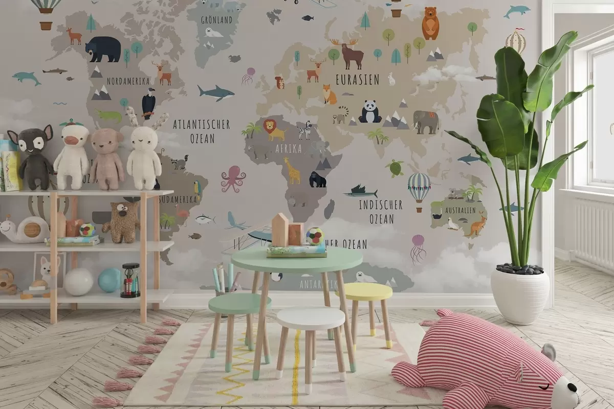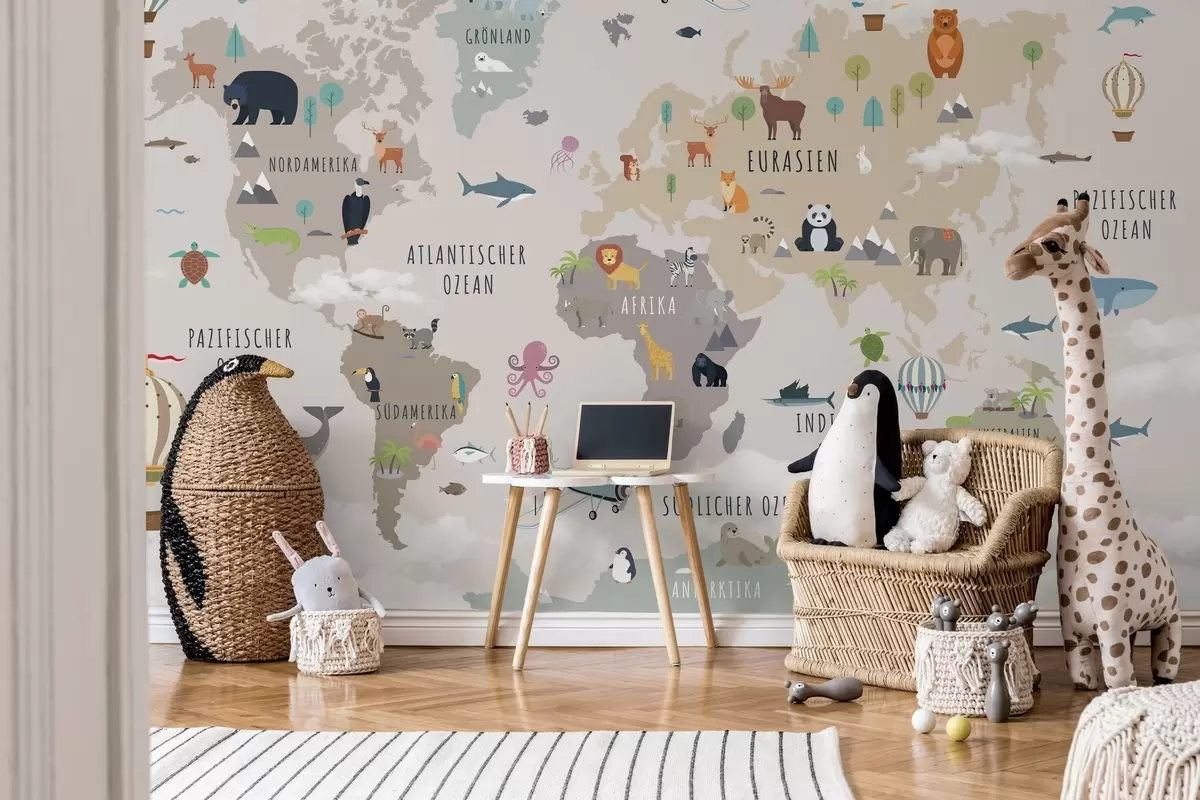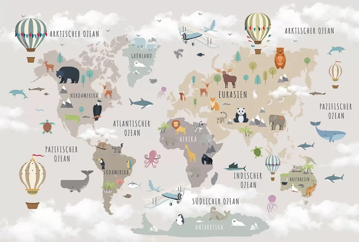 Fototapet Harta lumii pentru copii cu animale și baloane cu aer cald. Limba germană Nr. c00002de