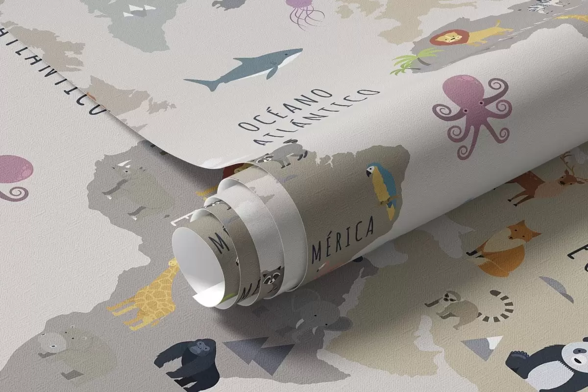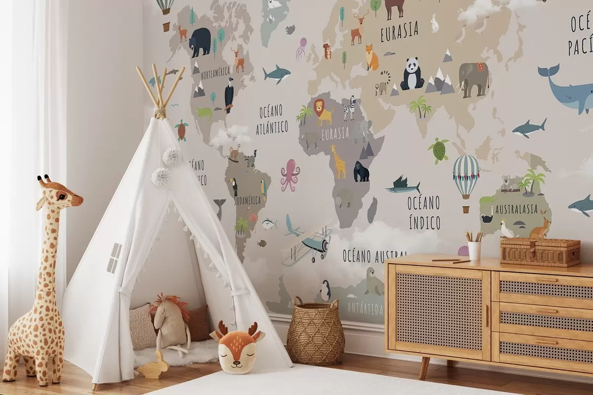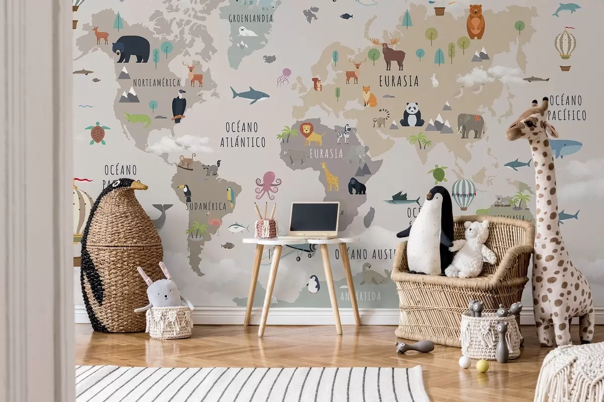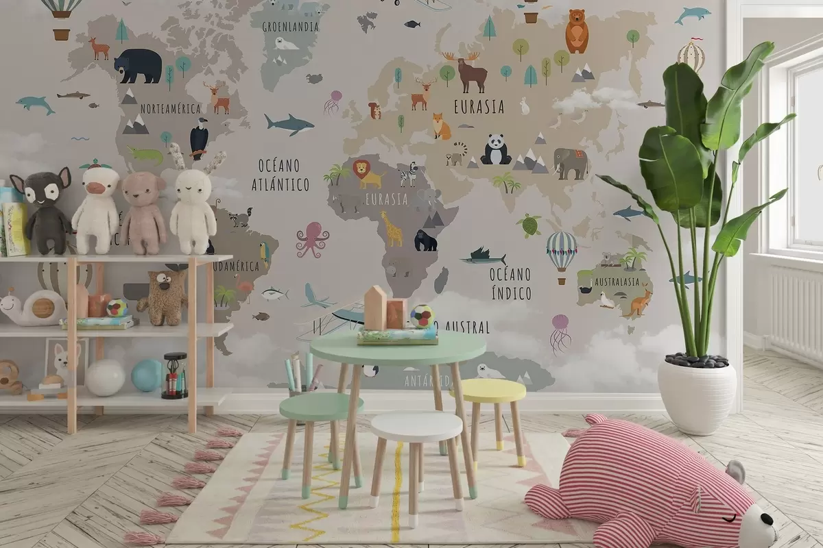 Fototapet Harta lumii pentru copii cu animale și baloane cu aer cald. Limba spaniolă Nr. c00002es