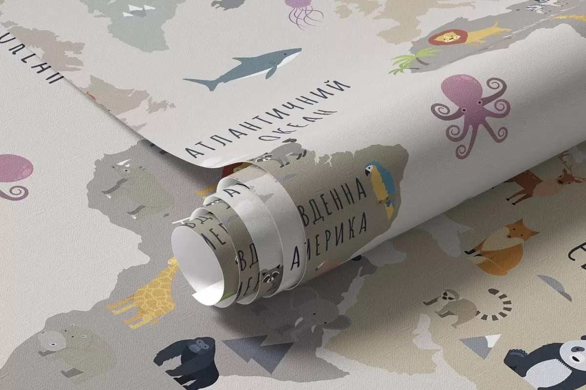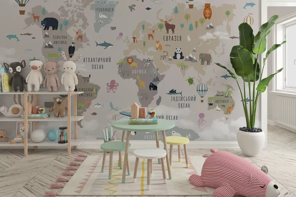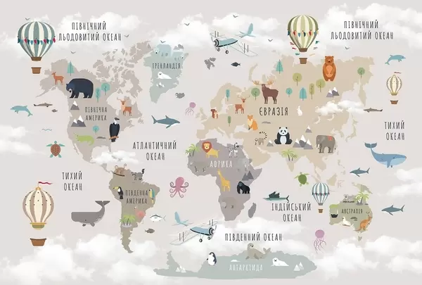 Fototapet Harta lumii pentru copii cu animale și baloane cu aer cald. Limba ucraineană Nr. c00002uk
