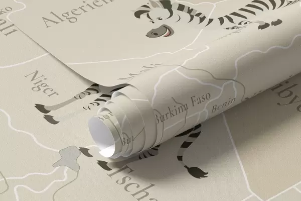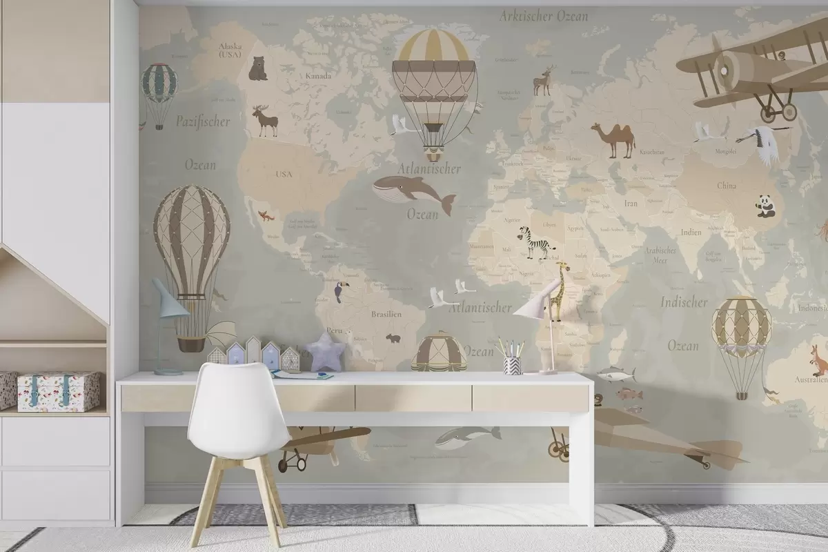 Fototapet Harta lumii pentru copii cu animale, avioane și baloane cu aer cald. Limba germană. Culoare bej. Nr. c00003de