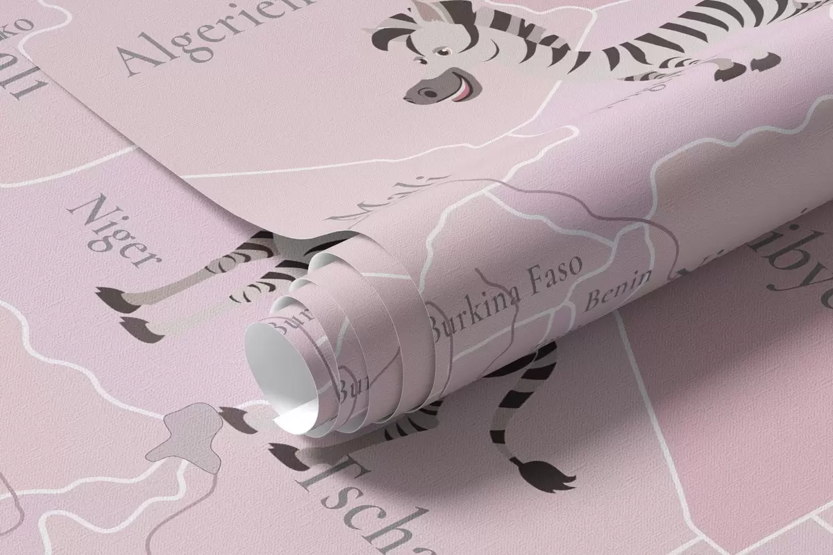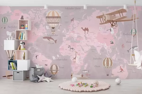 Fototapet Harta lumii pentru copii cu animale, avioane și baloane cu aer cald. Limba germană. Culoare roz. Nr. c00003dev3