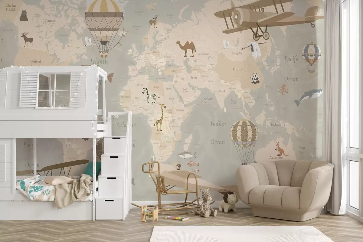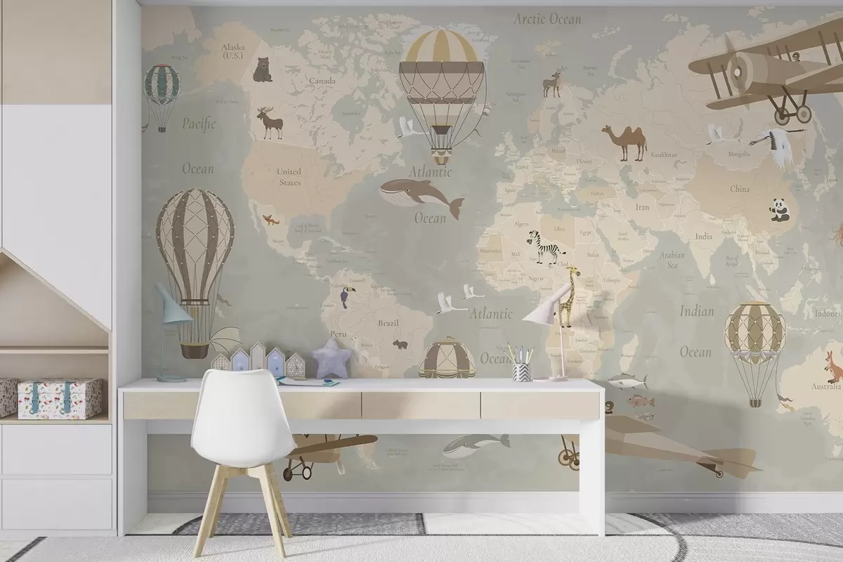 Fototapet Harta lumii pentru copii cu animale, avioane și baloane cu aer cald. Limba engleză. Culoare bej. Nr. c00003en