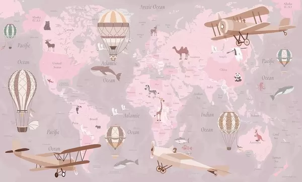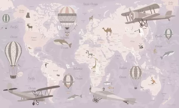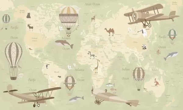 Fototapet Harta lumii pentru copii cu animale, avioane și baloane cu aer cald. Limba engleză. Culoare bej. Nr. c00003en