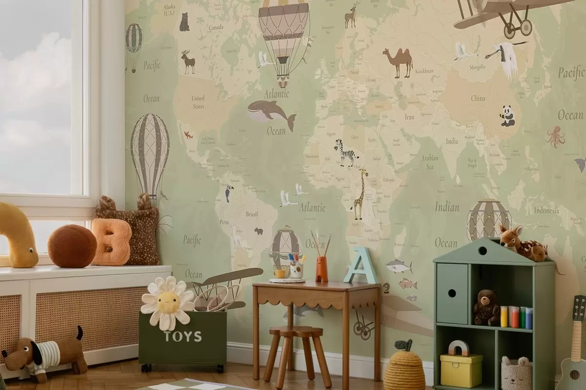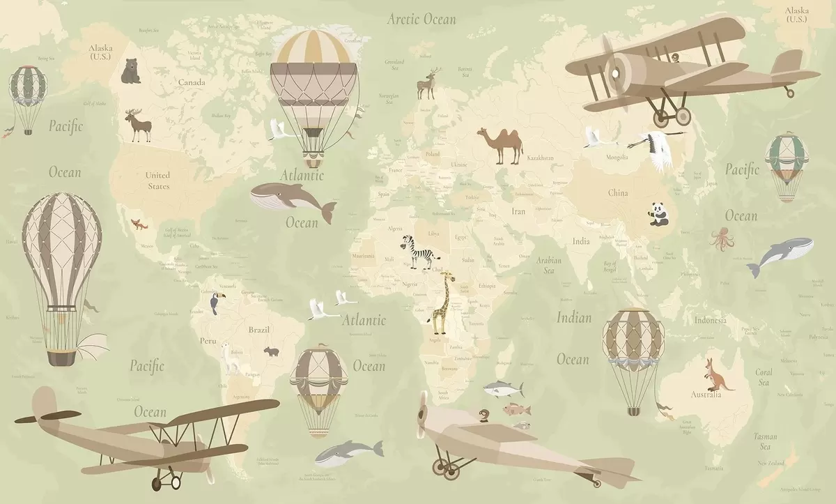 Fototapet Harta lumii pentru copii cu animale, avioane și baloane cu aer cald. Limba engleză. Culoare verde Nr. c00003env2