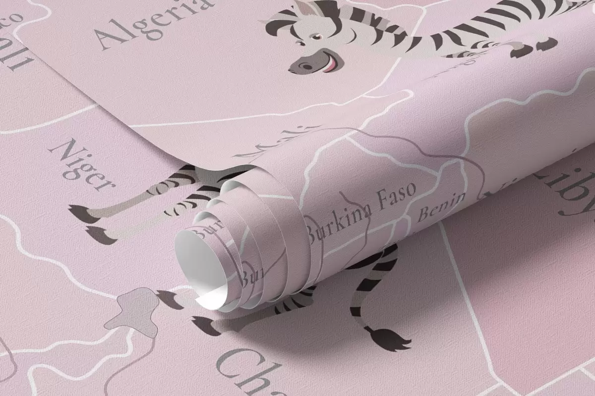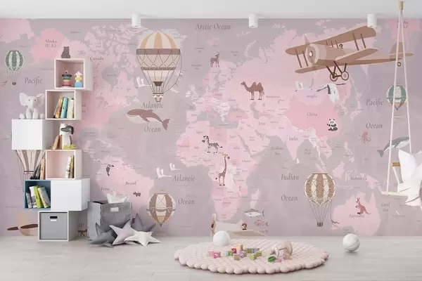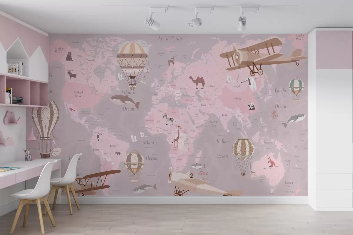 Fototapet Harta lumii pentru copii cu animale, avioane și baloane cu aer cald. Limba engleză. Culoare roz Nr. c00003env3