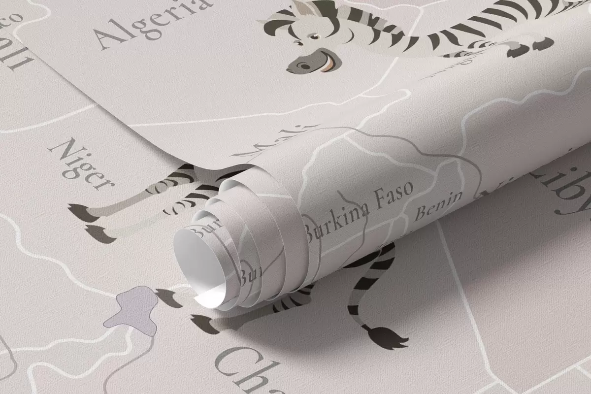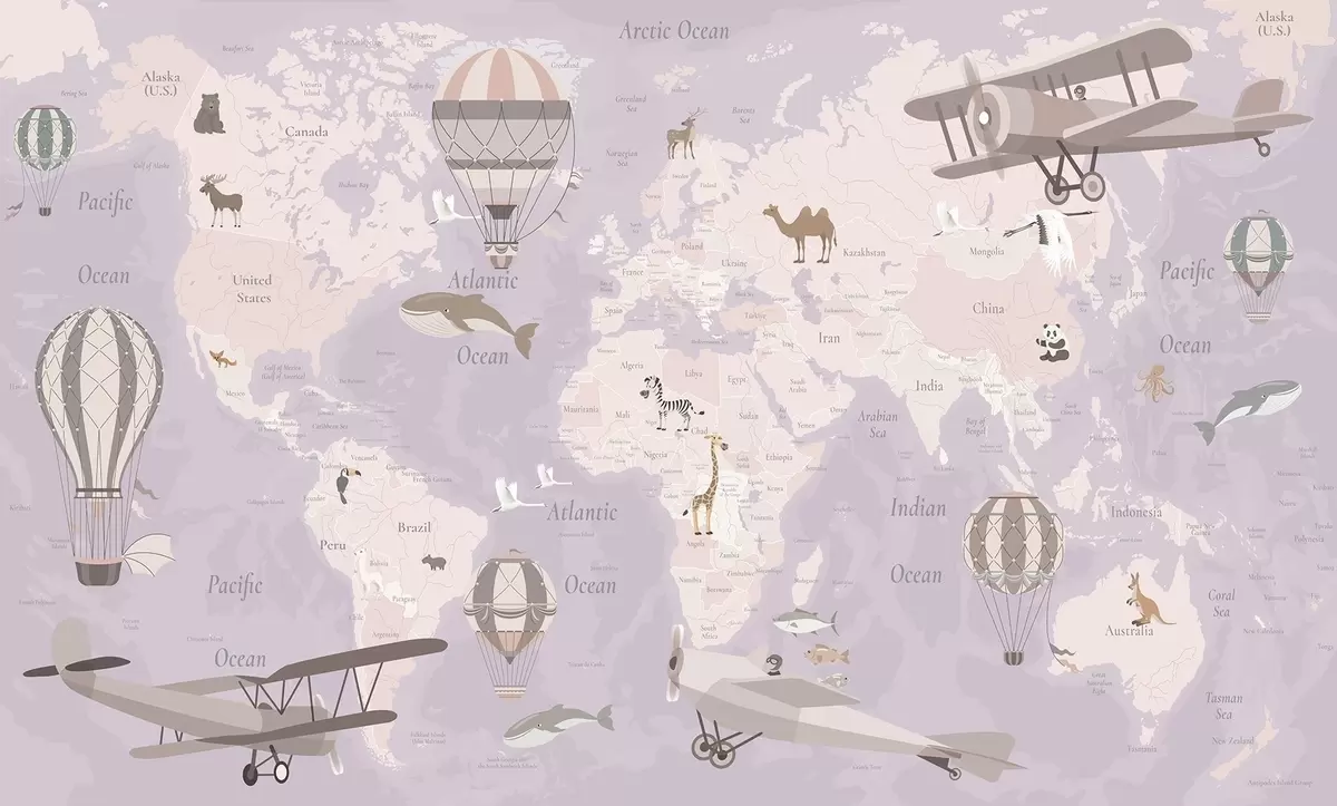 Fototapet Harta lumii pentru copii cu animale, avioane și baloane cu aer cald. Limba engleză. Culoare violet Nr. c00003env4