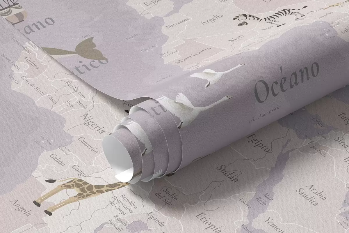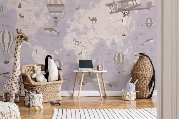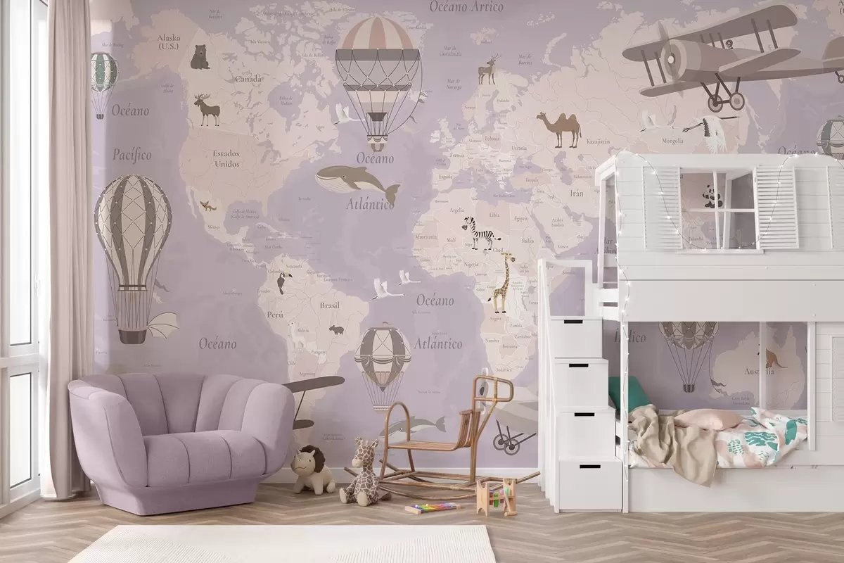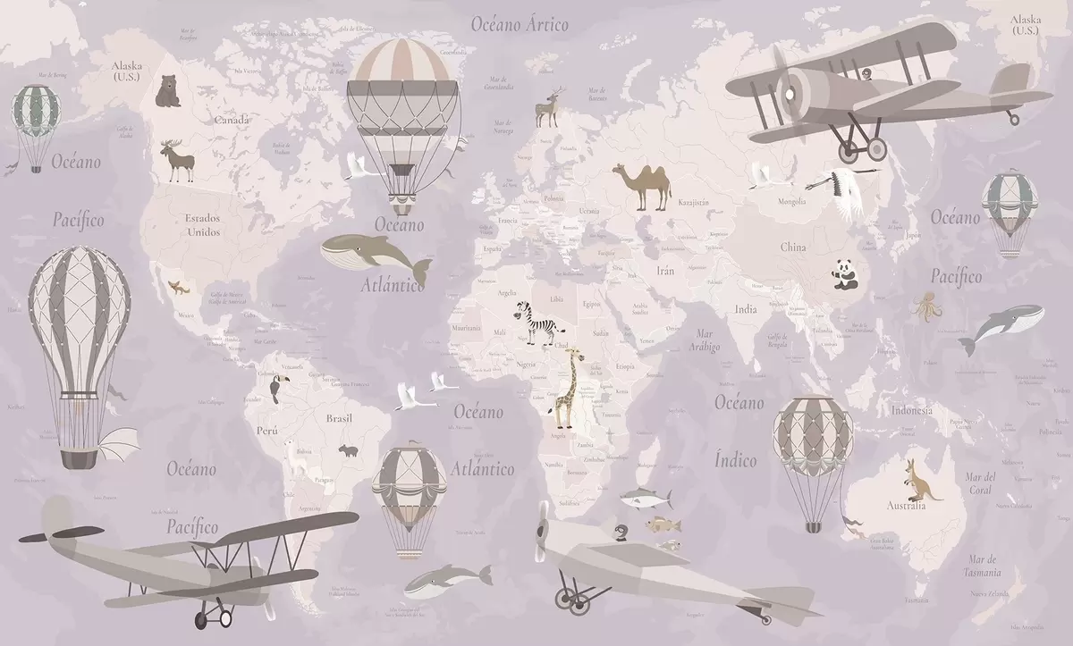 Fototapet Harta lumii pentru copii cu animale, avioane și baloane cu aer cald. Limba spaniolă. Culoare violet Nr. c00003esv4