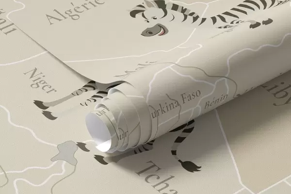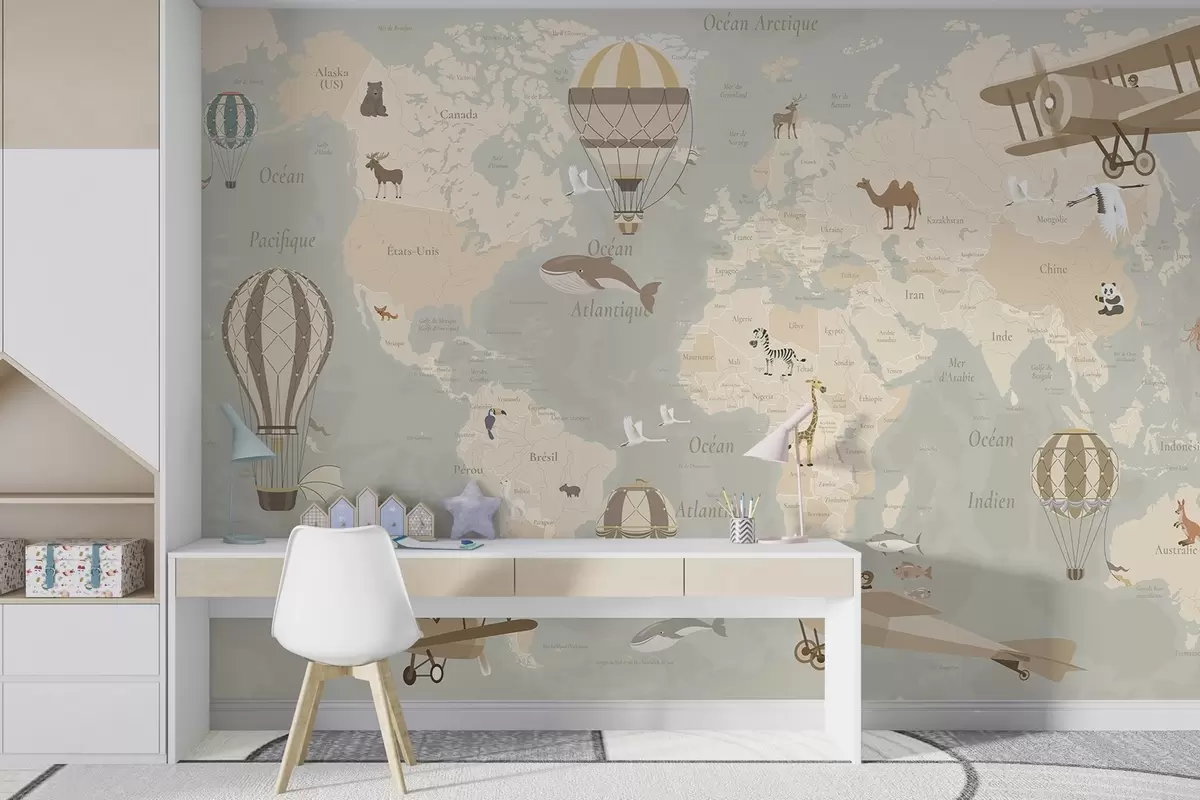 Fototapet Harta lumii pentru copii cu animale, avioane și baloane cu aer cald. Limba franceză. Culoare bej Nr. c00003fr
