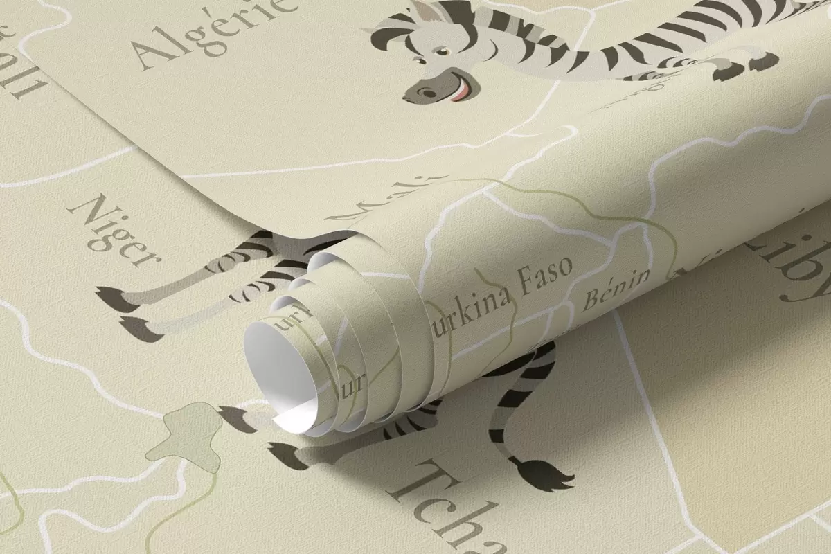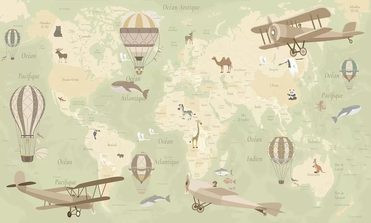 Fototapet Harta lumii pentru copii cu animale, avioane și baloane cu aer cald. Limba franceză. Culoare verde Nr. c00003frv2