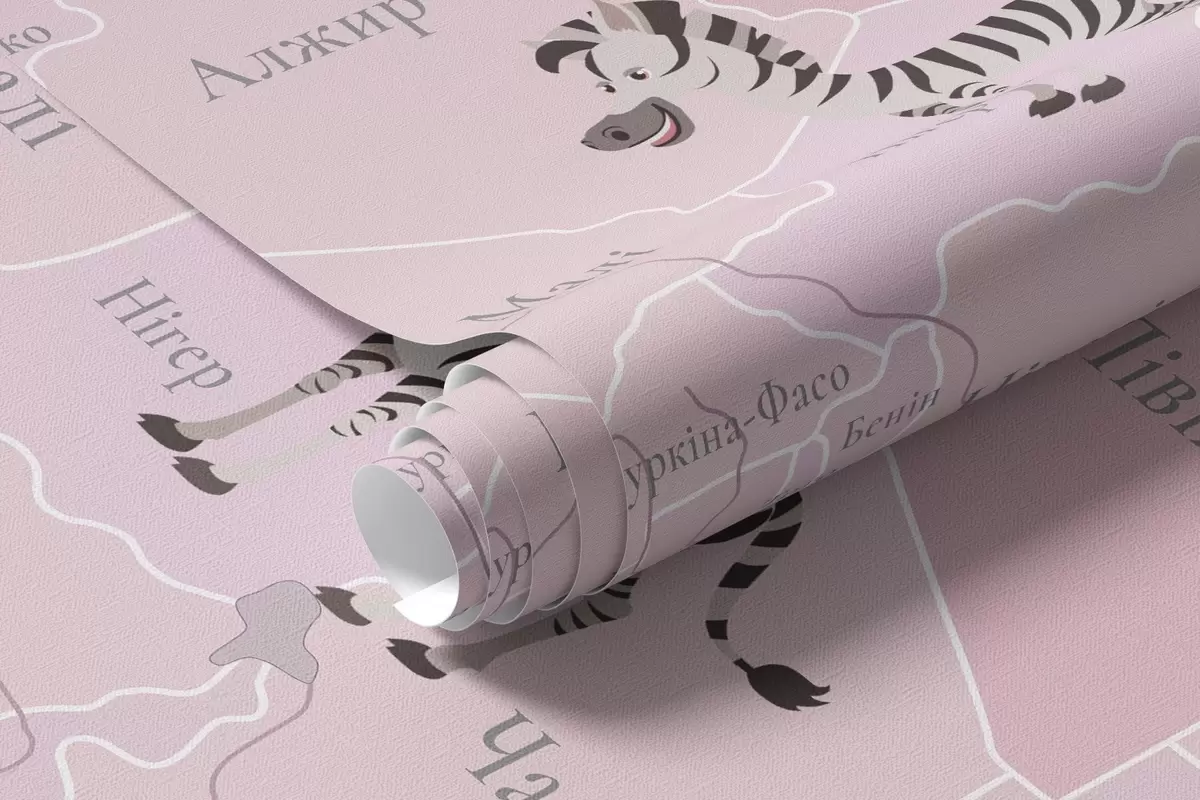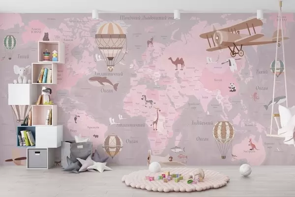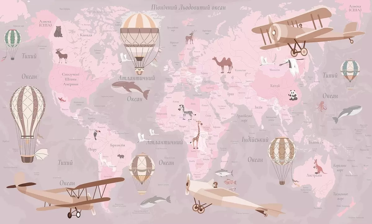Fototapet Harta lumii pentru copii cu animale, avioane și baloane cu aer cald. Limba ucraineană. Culoare roz. Nr. c00003ukv3