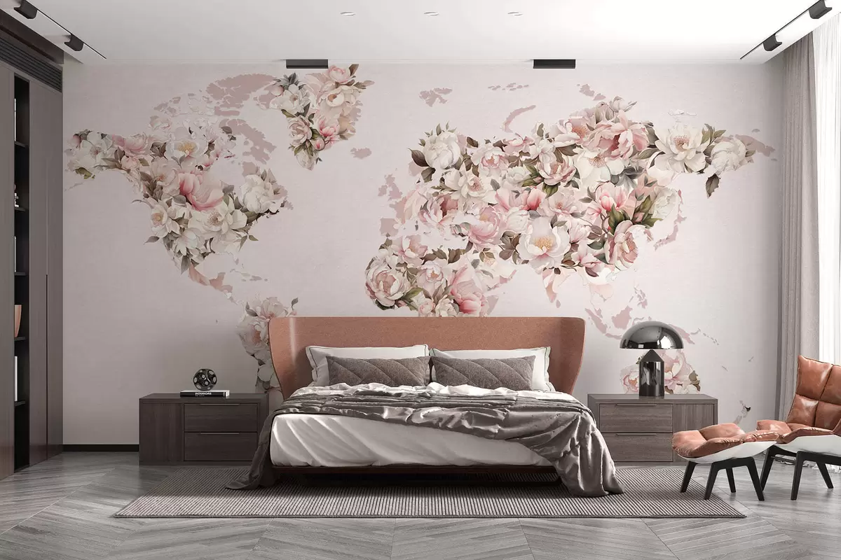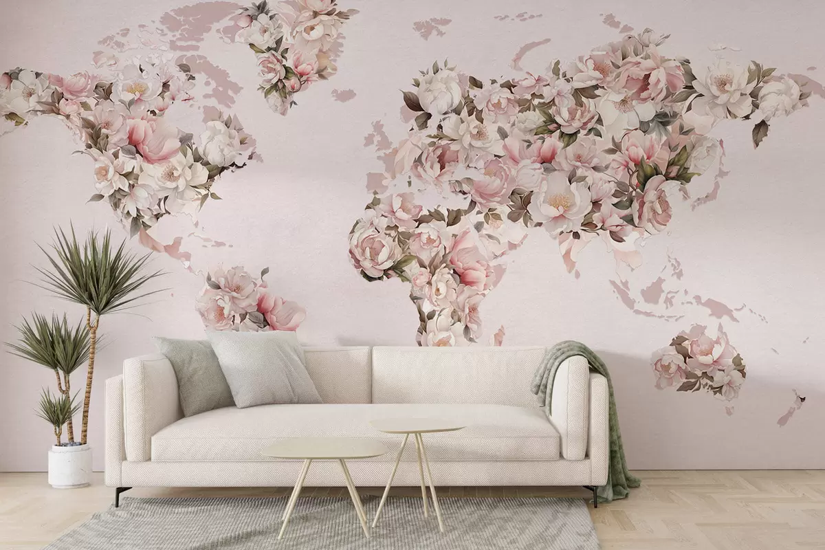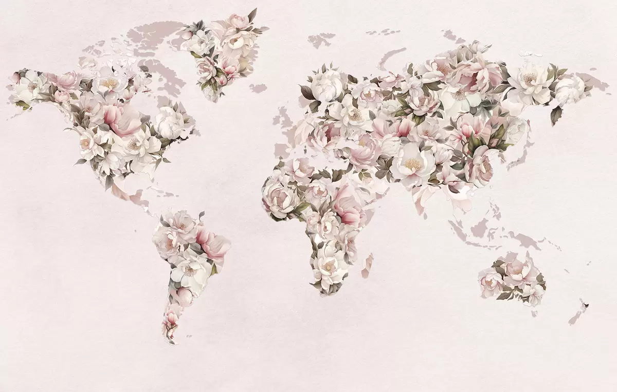 Fototapet O hartă a lumii roz, alcătuită din bujori mari, albi și roz Nr. c00005