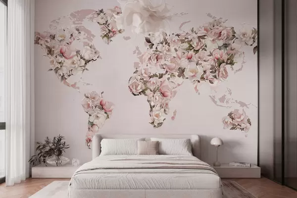 Fototapet O hartă a lumii roz, alcătuită din bujori mari, albi și roz Nr. c00005