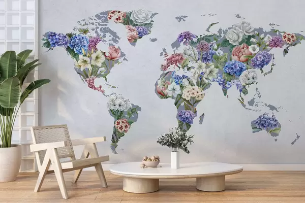 Fototapet O hartă colorată a lumii realizată dintr-o varietate de flori în culori vii Nr. c00006