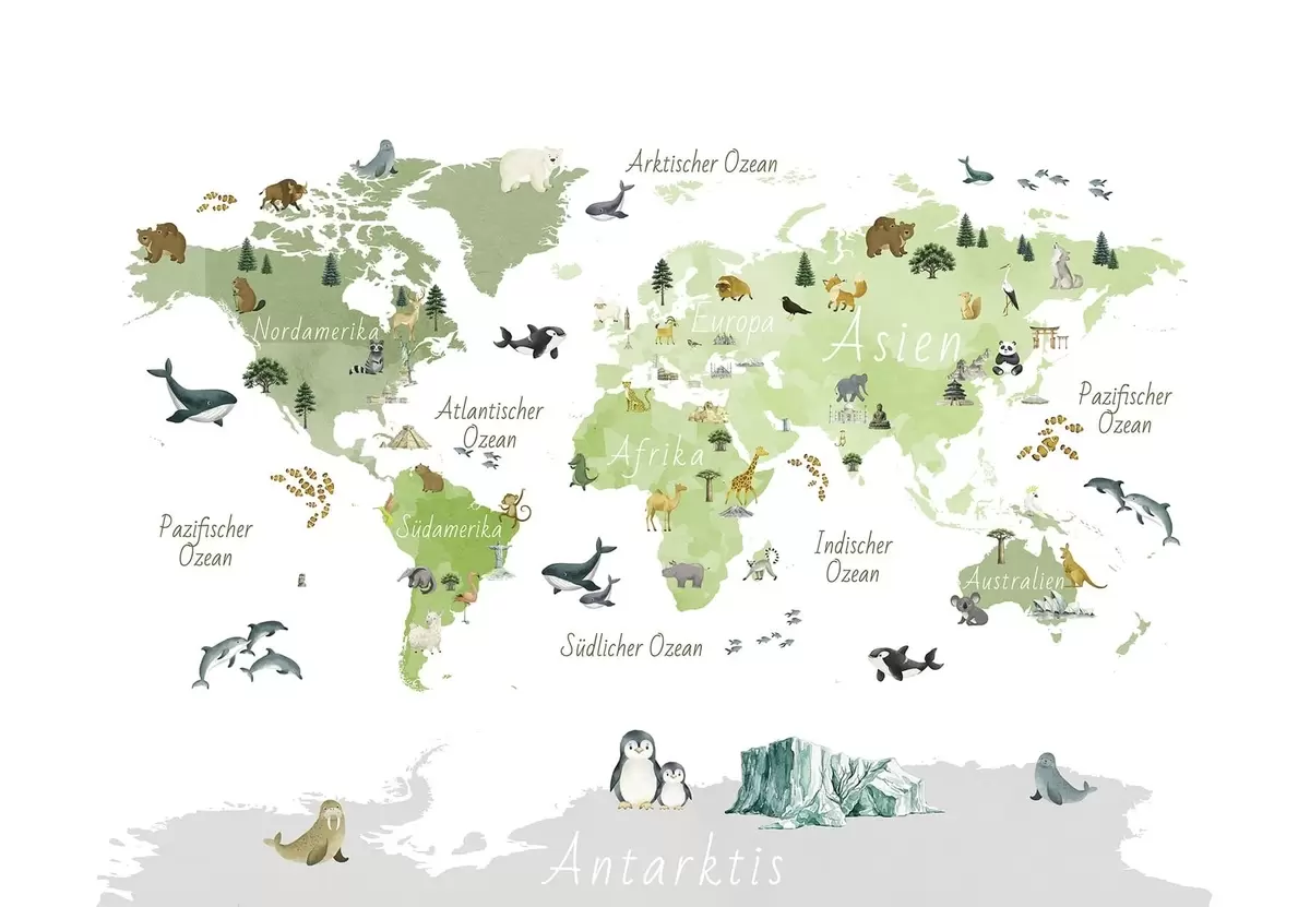 Fototapet O hartă verde în stil acuarelă, cu animale, plante și elemente arhitecturale. Inscripții în limba germană Nr. c00009dev2