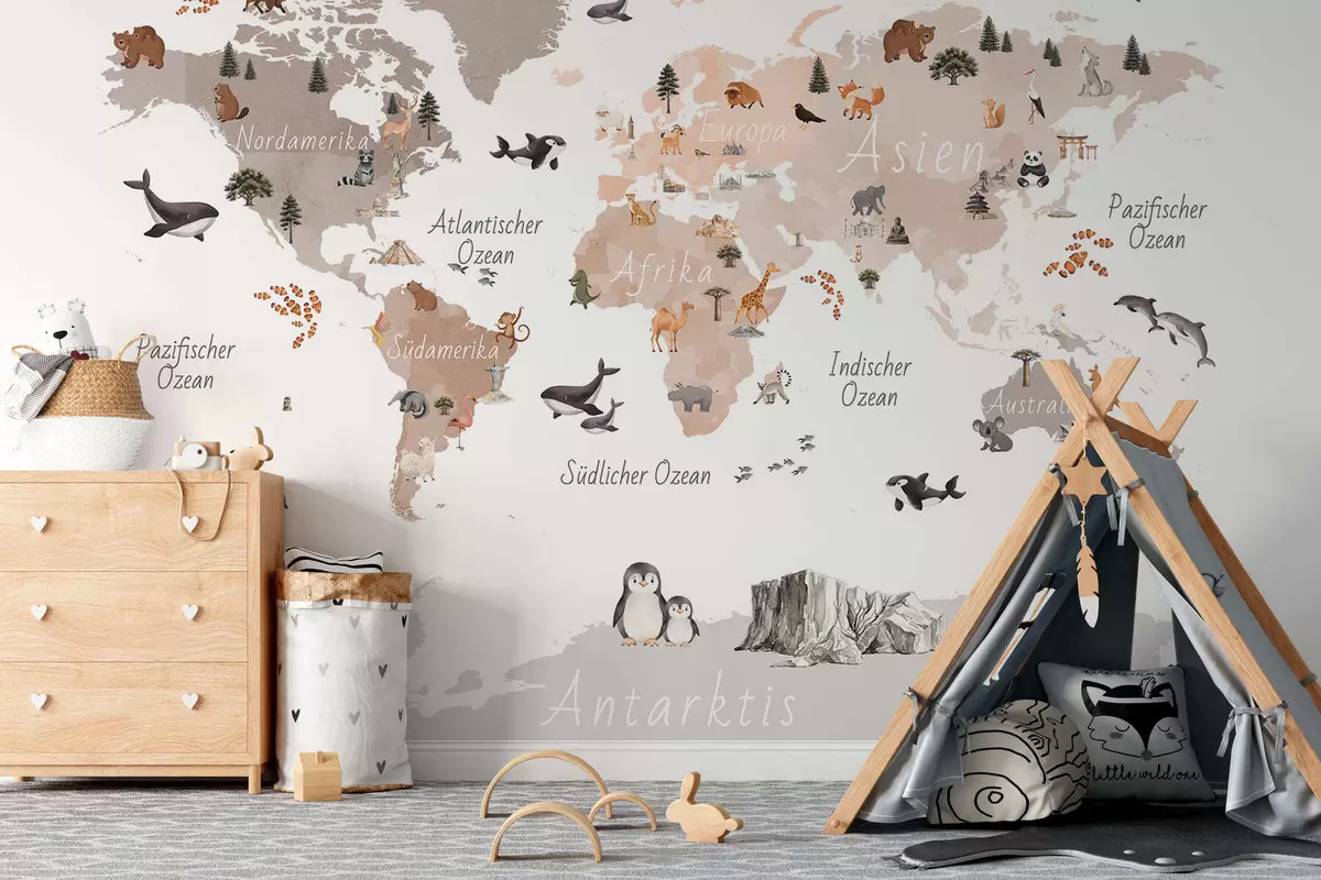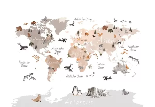 Fototapet O hartă în stil acuarelă, în nuanțe de bej, care prezintă animale, plante și elemente arhitecturale. Etichete în limba germană Nr. c00009dev3