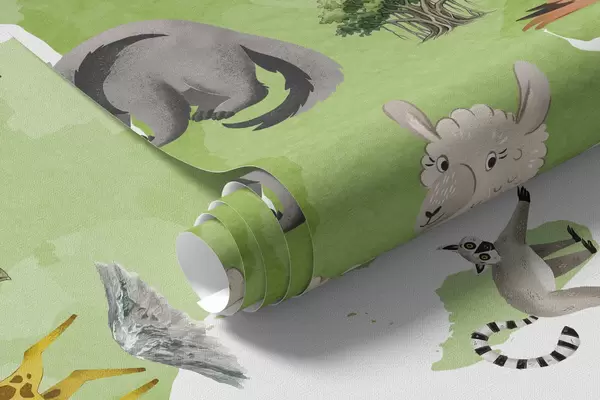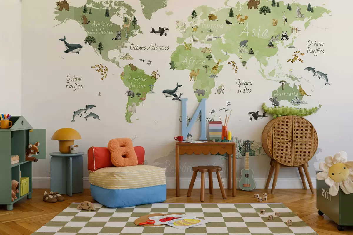 Fototapet O hartă verde în stil acuarelă, cu animale, plante și elemente arhitecturale. Inscripții în spaniolă Nr. c00009esv2