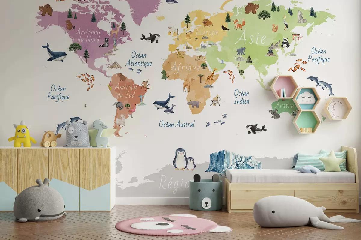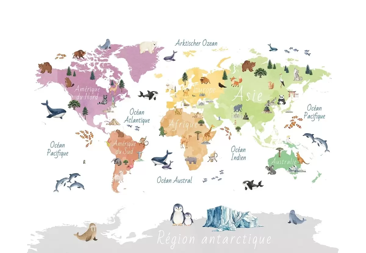 Fototapet O hartă colorată în stil acuarelă, care prezintă animale, plante și elemente arhitecturale. Legende în limba franceză Nr. c00009fr