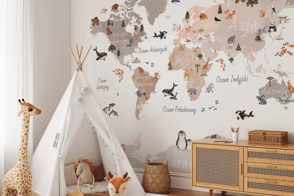 Fototapet O hartă în nuanțe de bej, realizată în stil acuarelă, care prezintă animale, plante și elemente arhitecturale. Etichete în limba poloneză Nr. c00009plv3