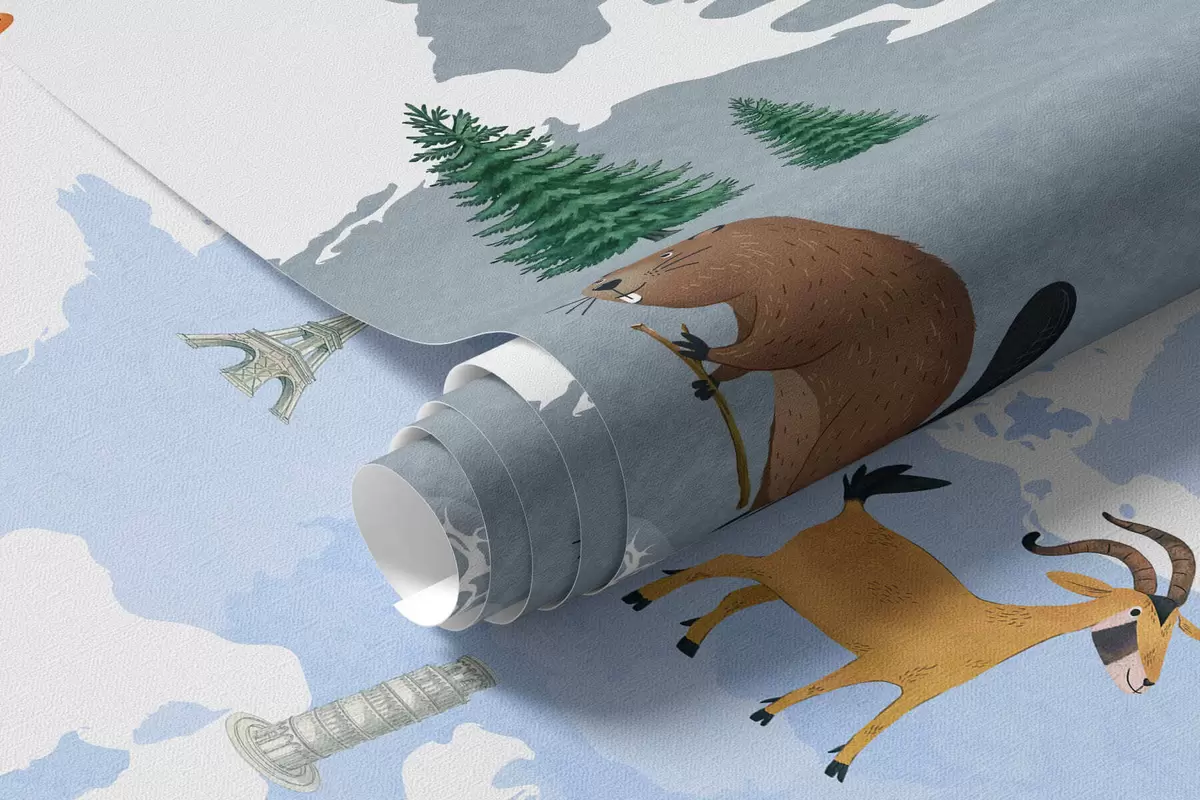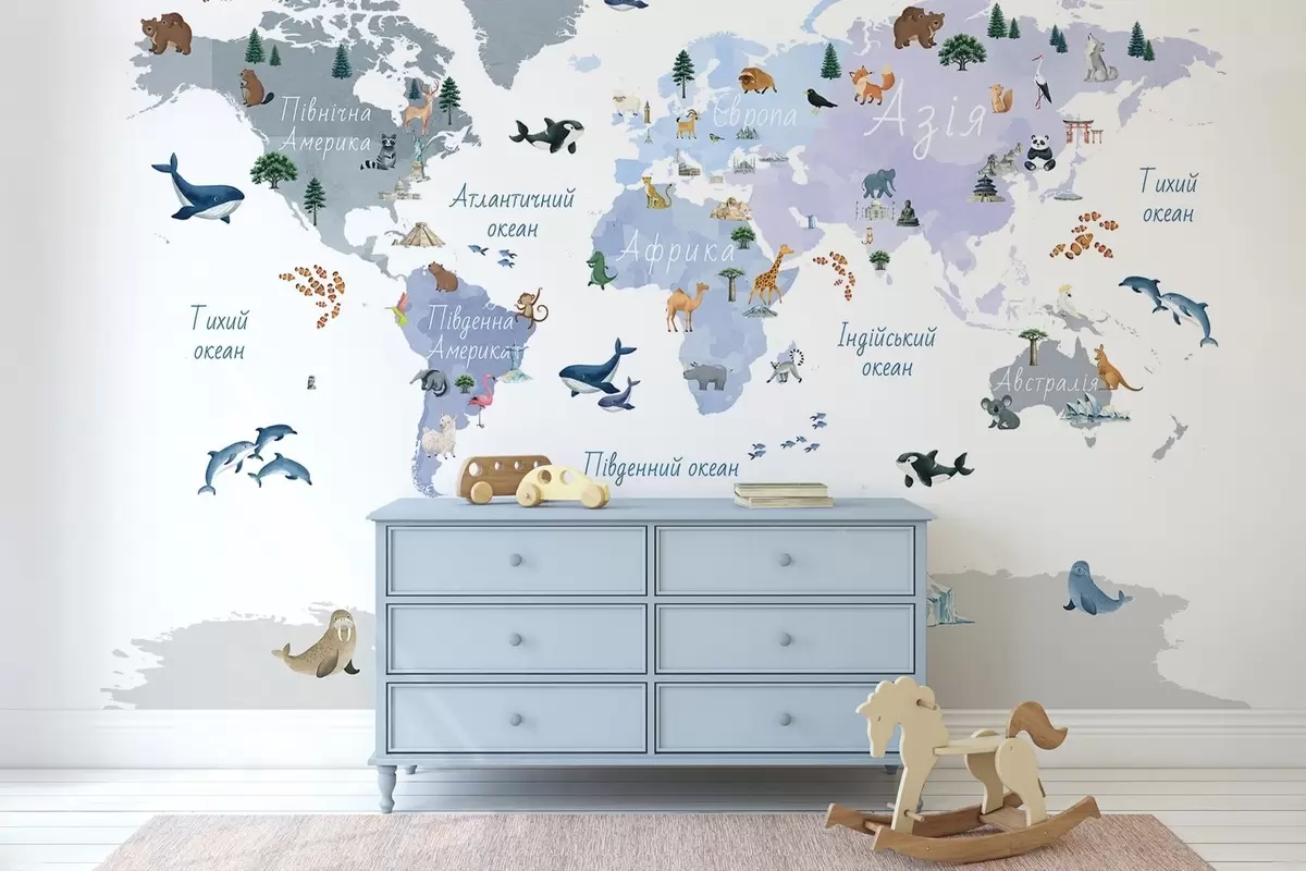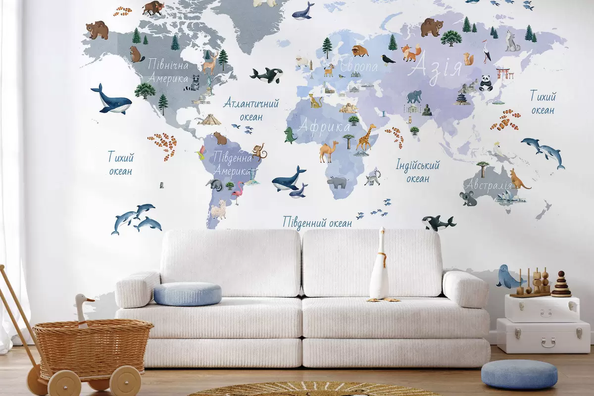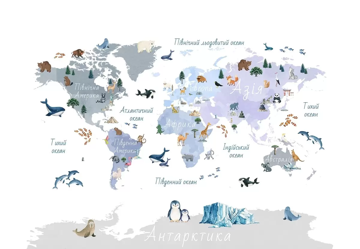 Fototapet O hartă albastră în stil acuarelă, cu animale, plante și elemente arhitecturale. Inscripții în limba ucraineană Nr. c00009ukv1