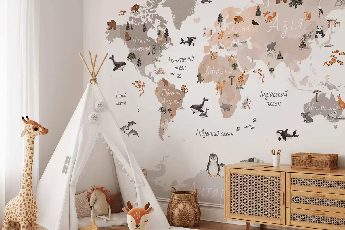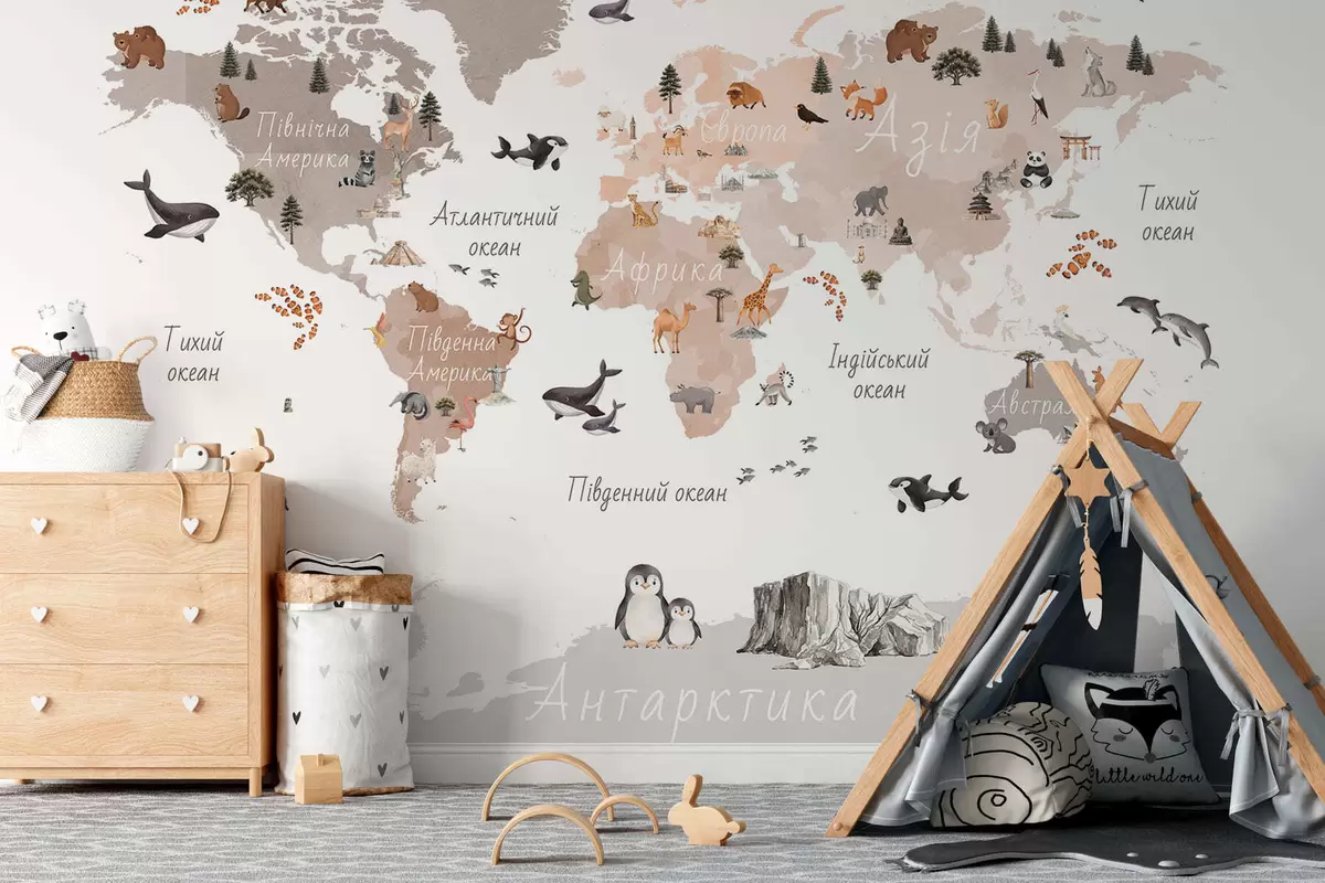 Fototapet O hartă în nuanțe de bej, realizată în stil acuarelă, care prezintă animale, plante și elemente arhitecturale. Inscripții în limba ucraineană Nr. c00009ukv3