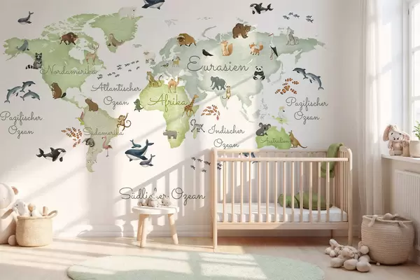 Fototapet O hartă verde în stil acuarelă, cu animale. Etichete în limba germană Nr. c00012dev2