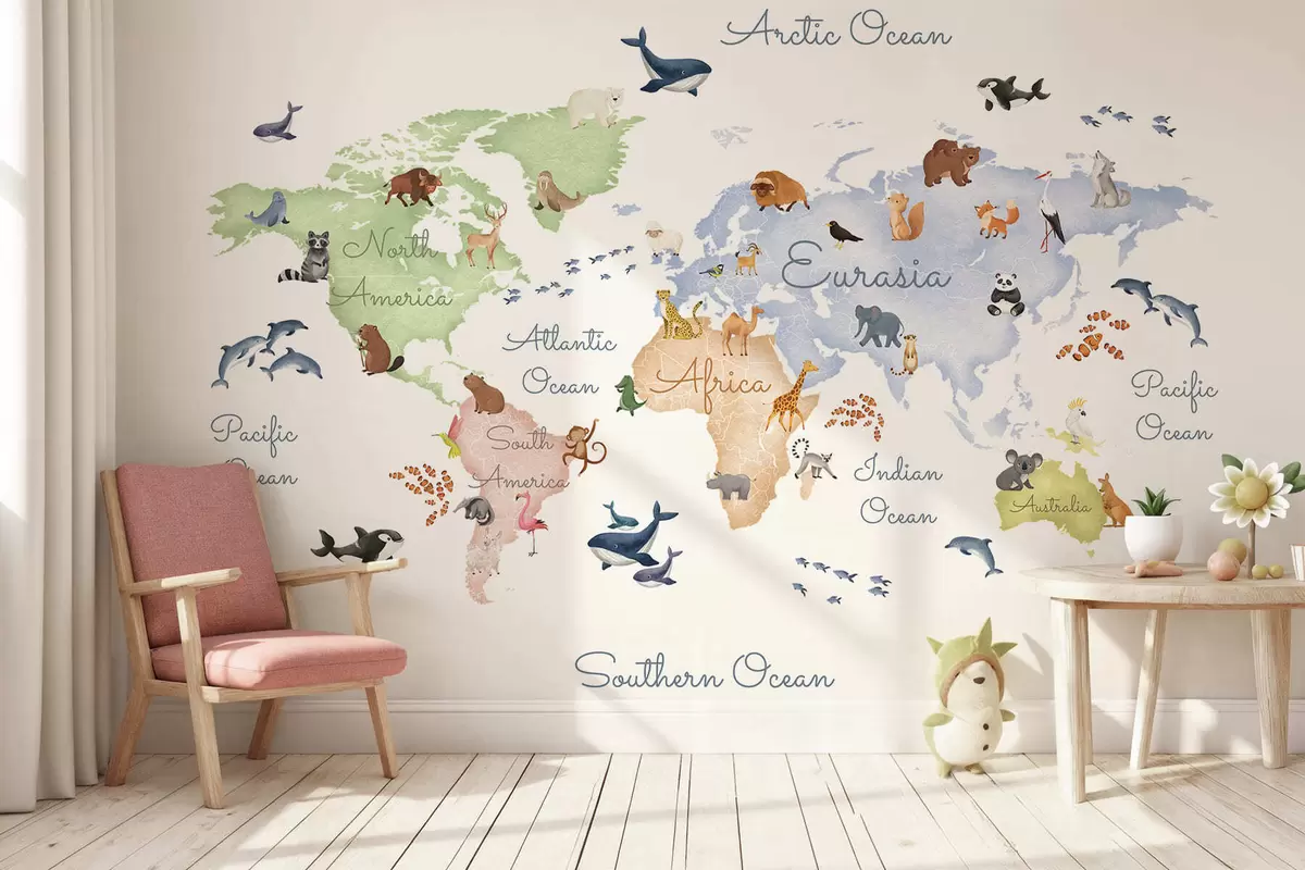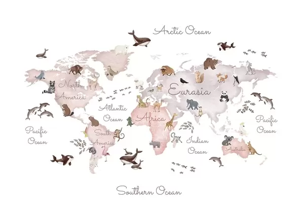 Fototapet O hartă colorată în stil acuarelă, cu animale. Denumiri în limba engleză Nr. c00012en
