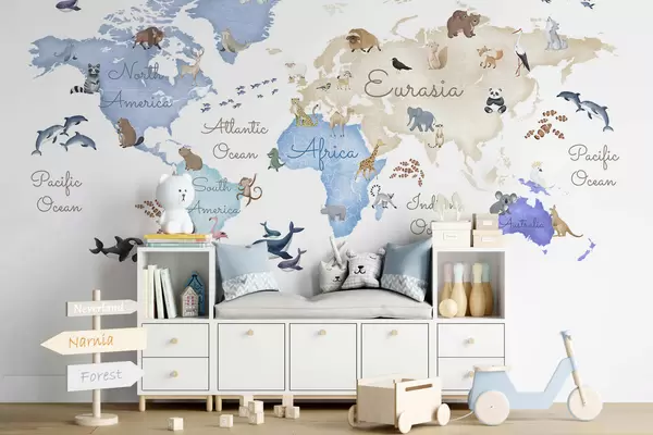 Fototapet O hartă albastră în stil acuarelă, cu animale. Etichete în limba engleză Nr. c00012env1