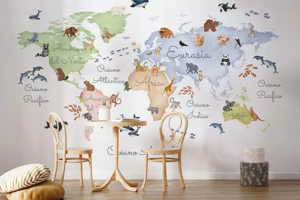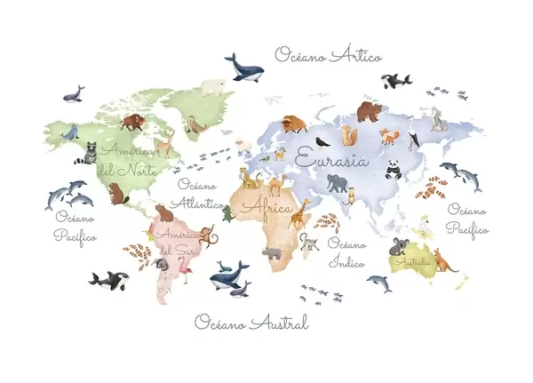 Fototapet O hartă colorată în stil acuarelă, cu animale. Denumiri în spaniolă Nr. c00012es