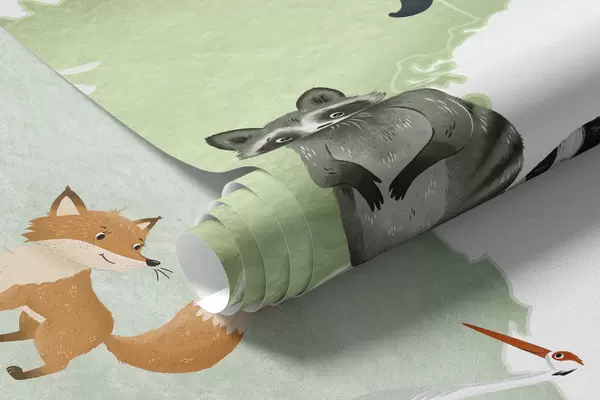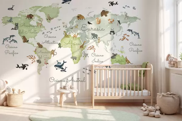 Fototapet O hartă verde în stil acuarelă, cu animale. Etichete în spaniolă Nr. c00012esv2