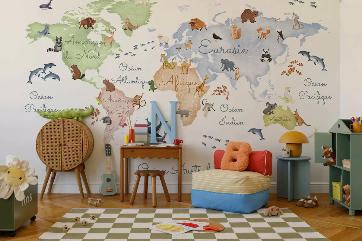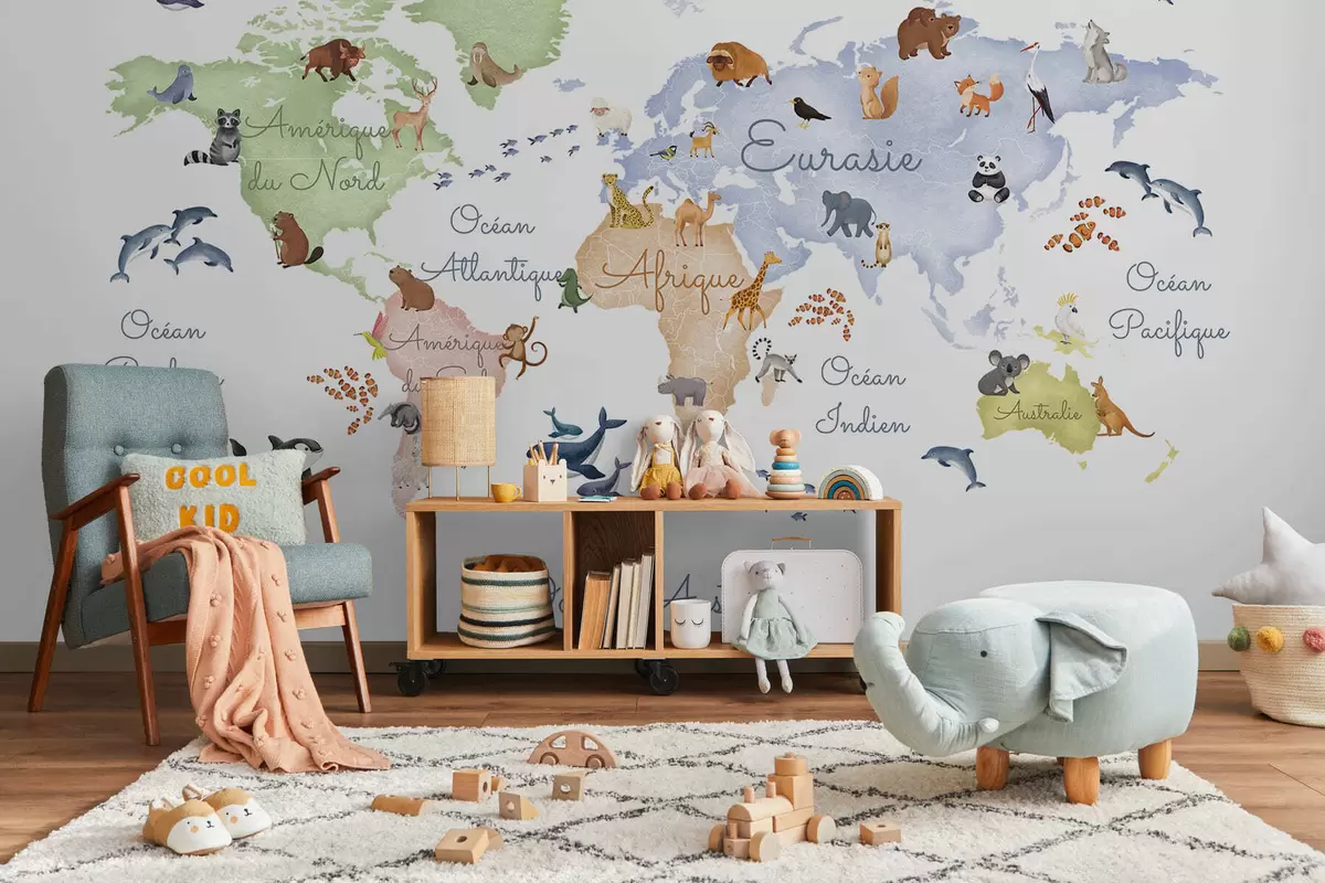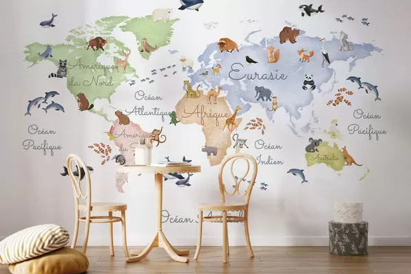 Fototapet O hartă colorată în stil acuarelă, cu animale. Denumiri în limba franceză Nr. c00012fr
