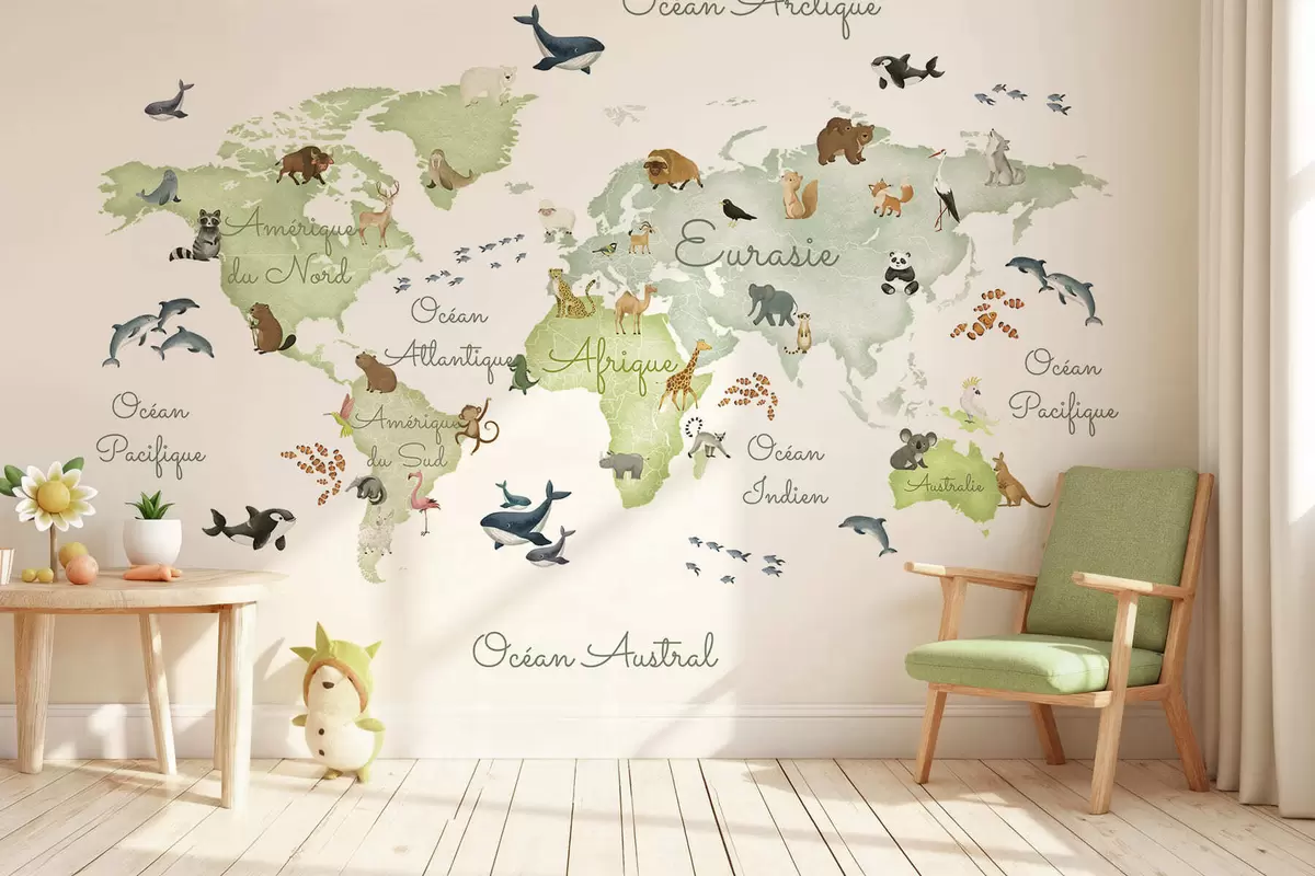Fototapet O hartă verde în stil acuarelă, cu animale. Etichete în limba franceză Nr. c00012frv2