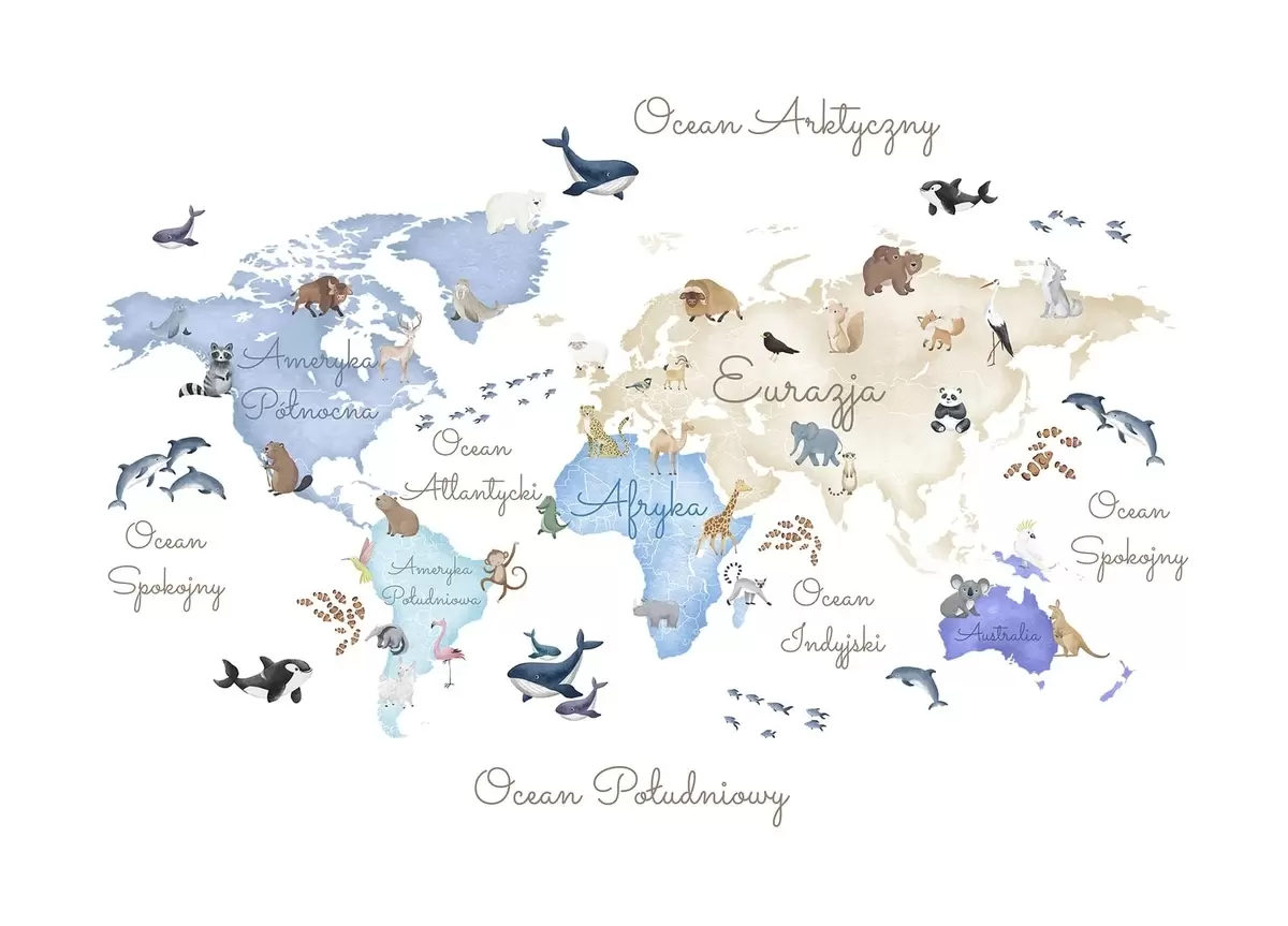 Fototapet O hartă albastră în stil acuarelă, cu animale. Etichete în limba poloneză Nr. c00012plv1