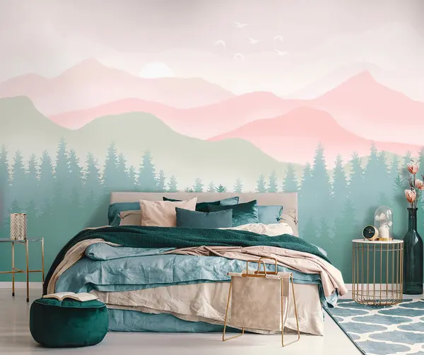 Fototapet Munți cețoși cu pădure de pin, culori naturale moi, roz și verde Nr. u98774