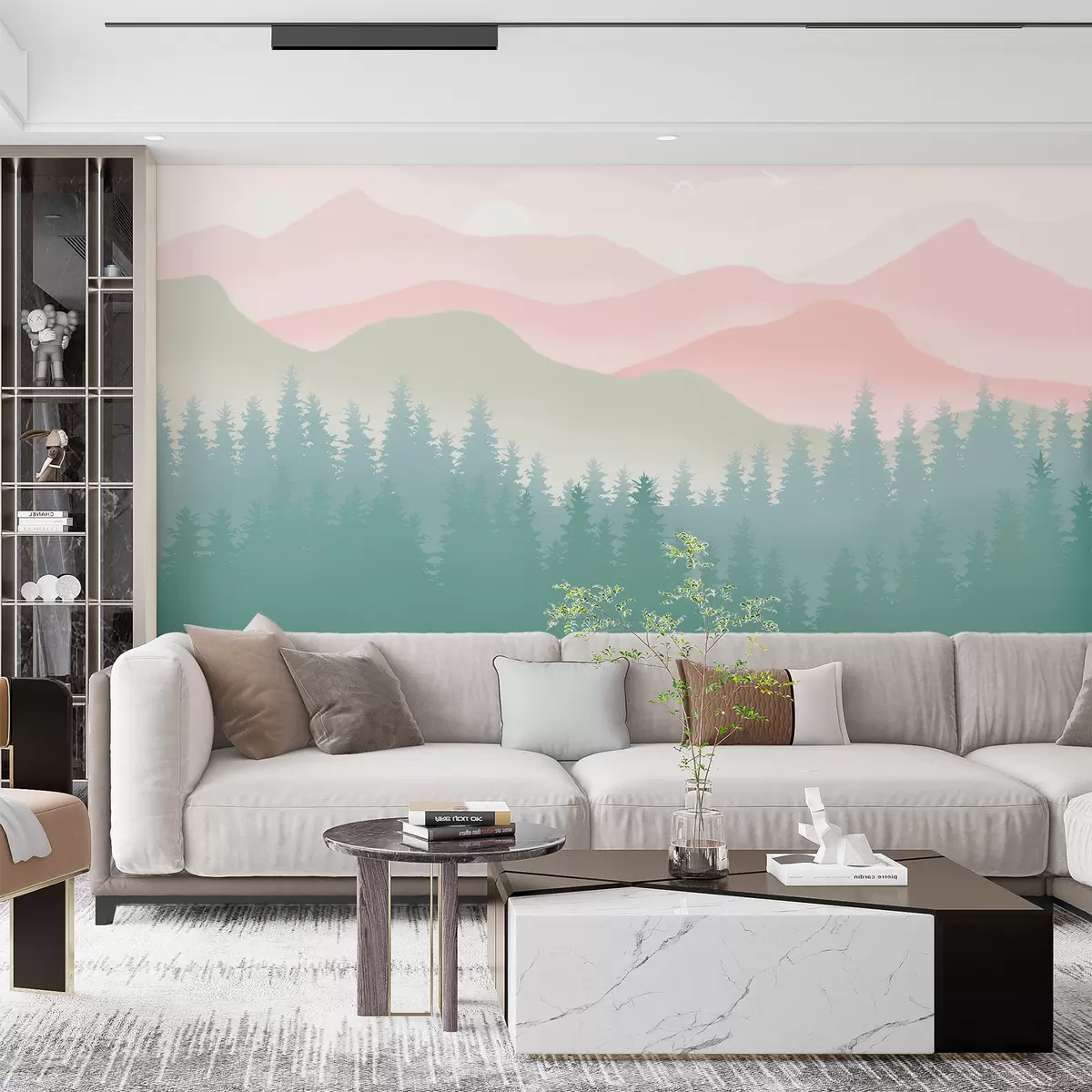 Fototapet Munți cețoși cu pădure de pin, culori naturale moi, roz și verde Nr. u98774