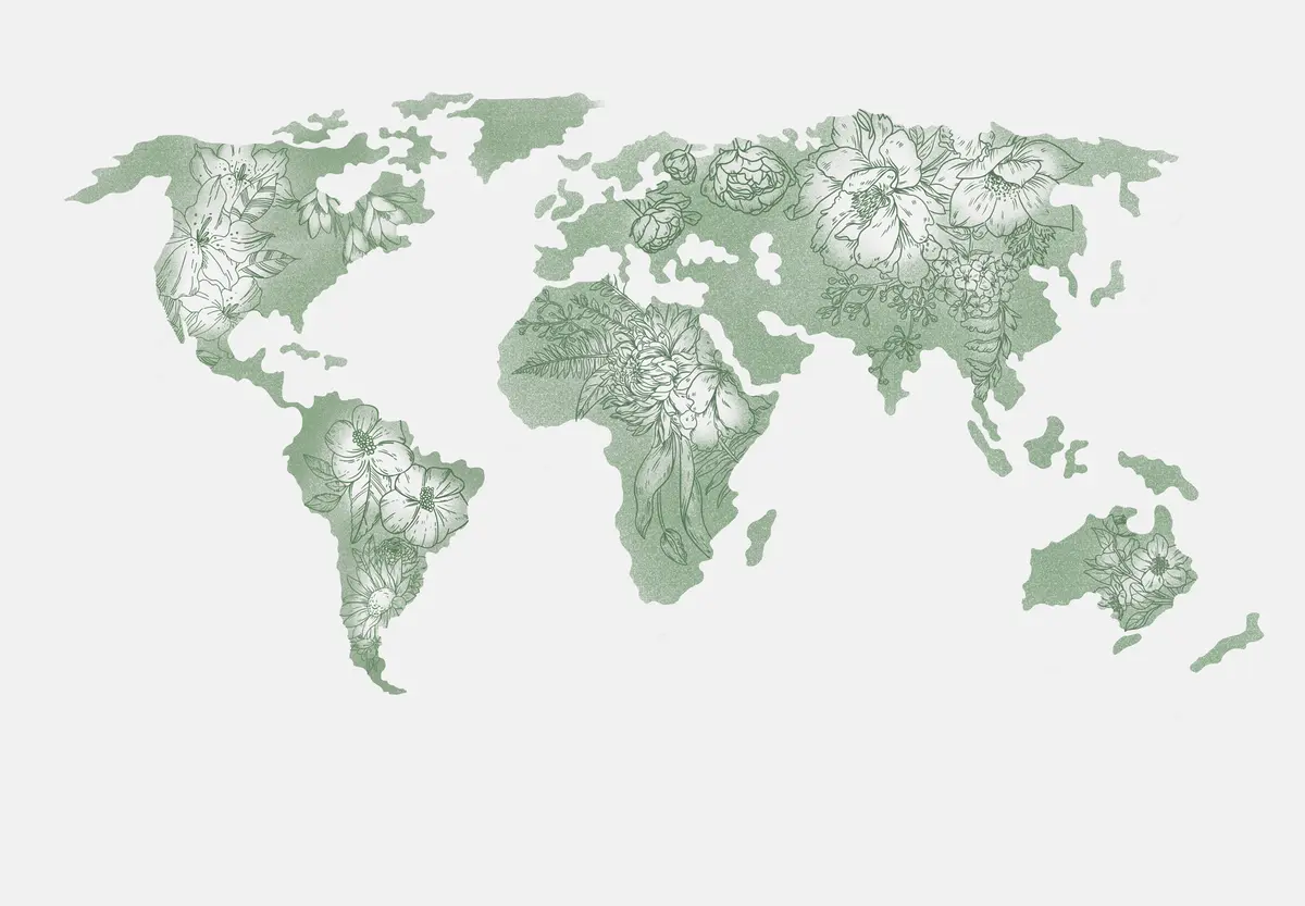 Fototapet Floral World Map, ornamentale, bujori, crin, culoare verde, linie de desen arta Nr. u99734v3