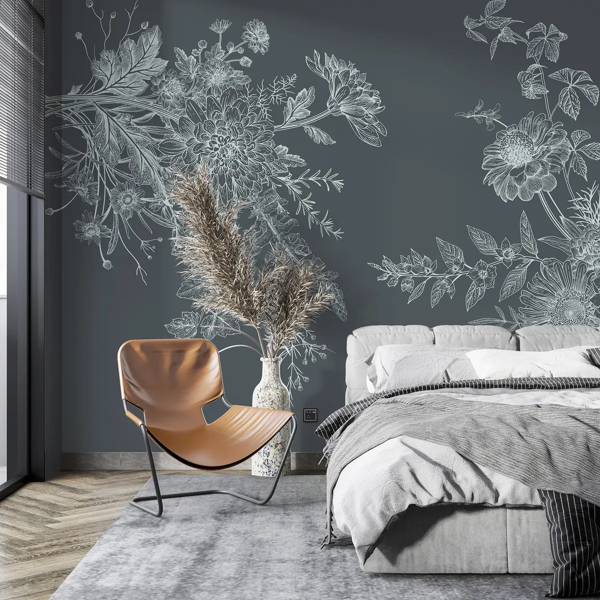 Fototapet Ornament floral, minimalism, line art, stil boho, rustic, bujor, margaretă, fundal albastru închis Nr. w00381v1