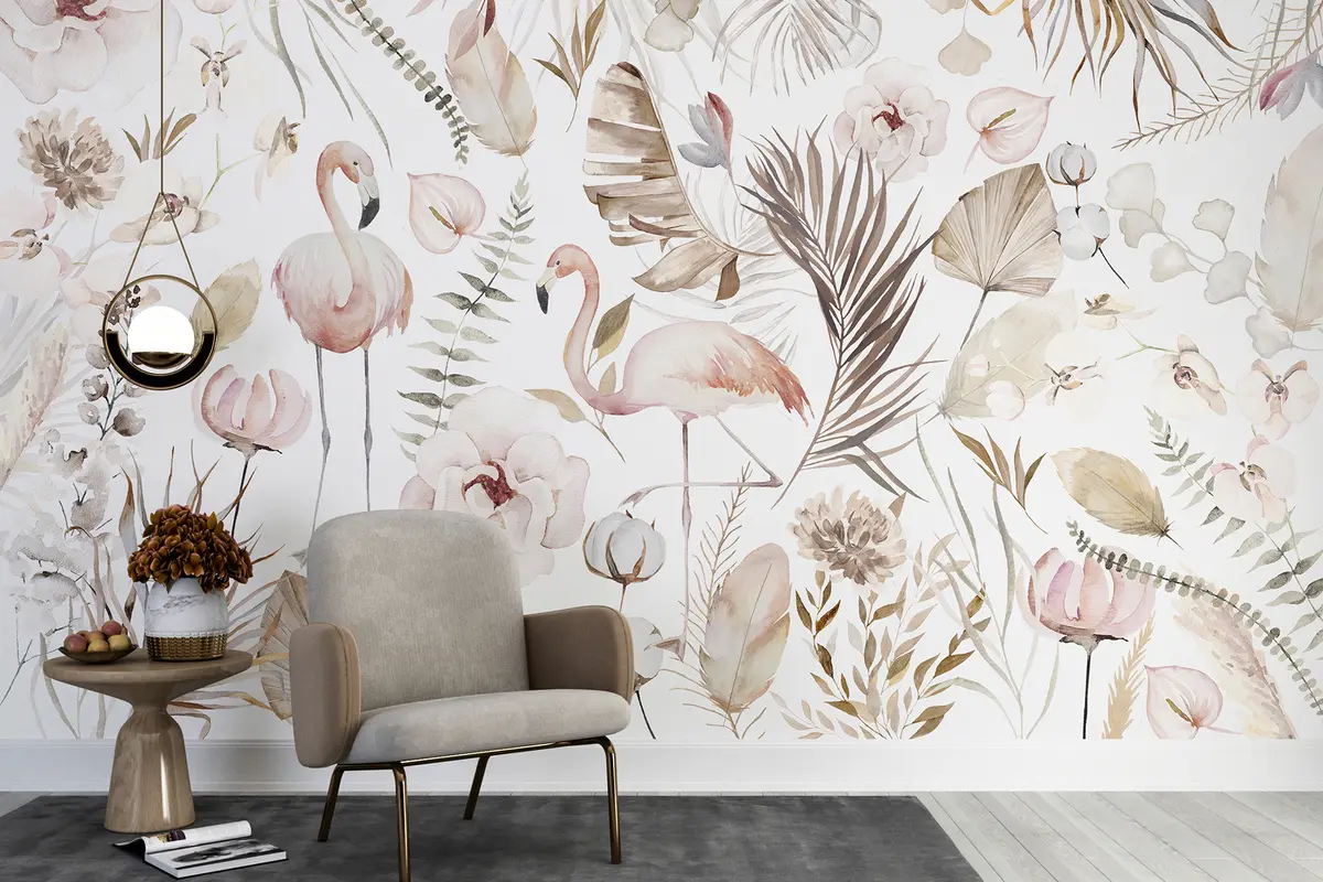 Fototapet Boho stil acuarelă artă, flamingo, frunze tropicale, bumbac, orhidee, bujor, roz și bej Nr. w00507