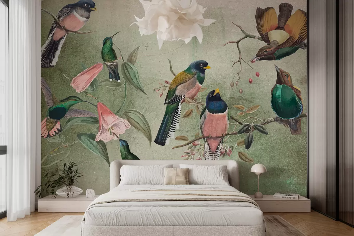 Fototapet Un grup de păsări colorate cocoțate pe ramuri în fundal texturat Nr. w00543